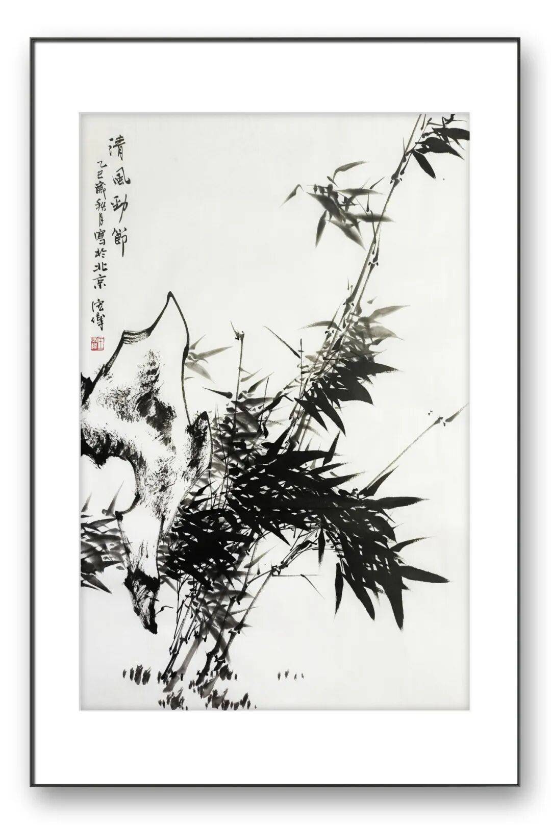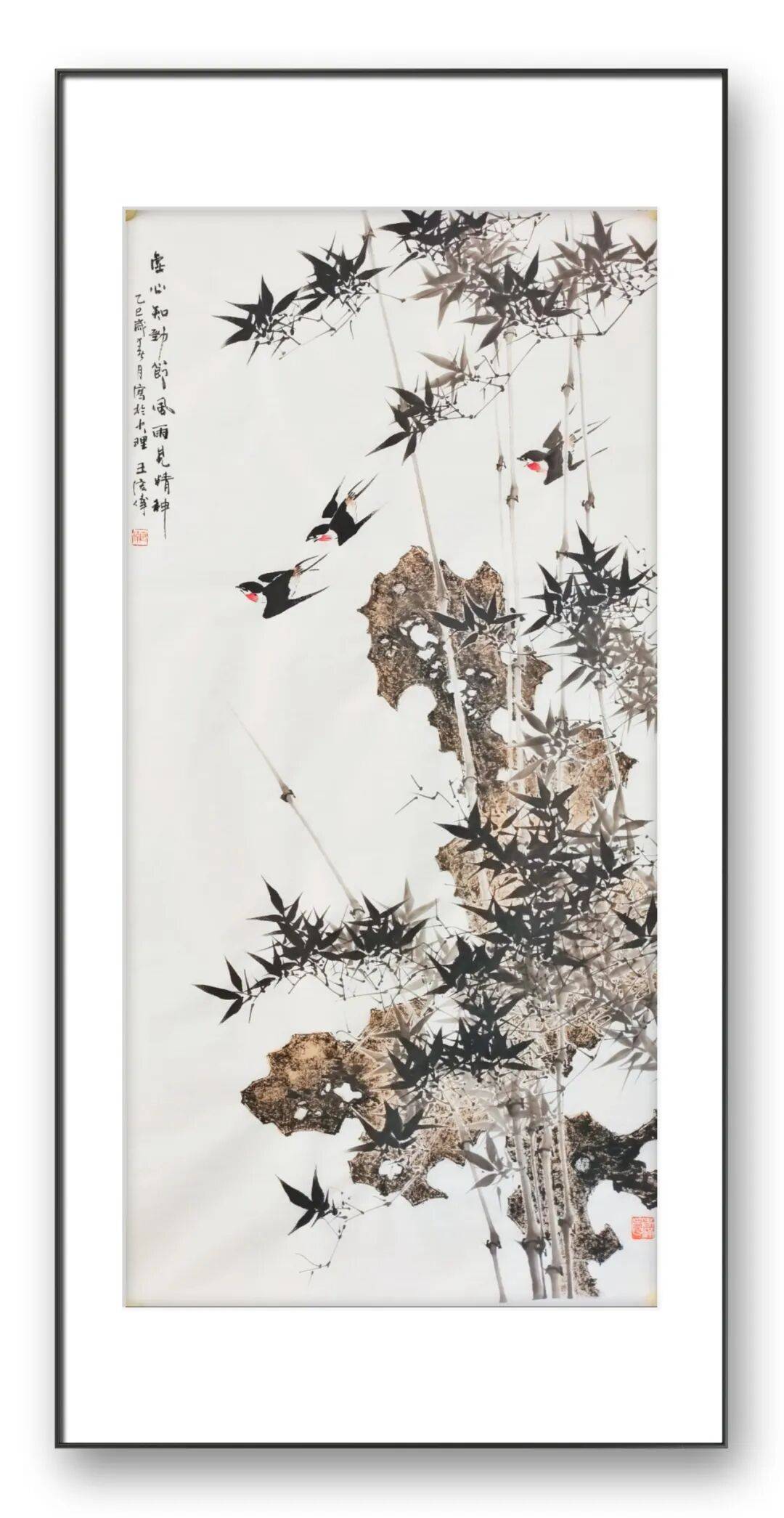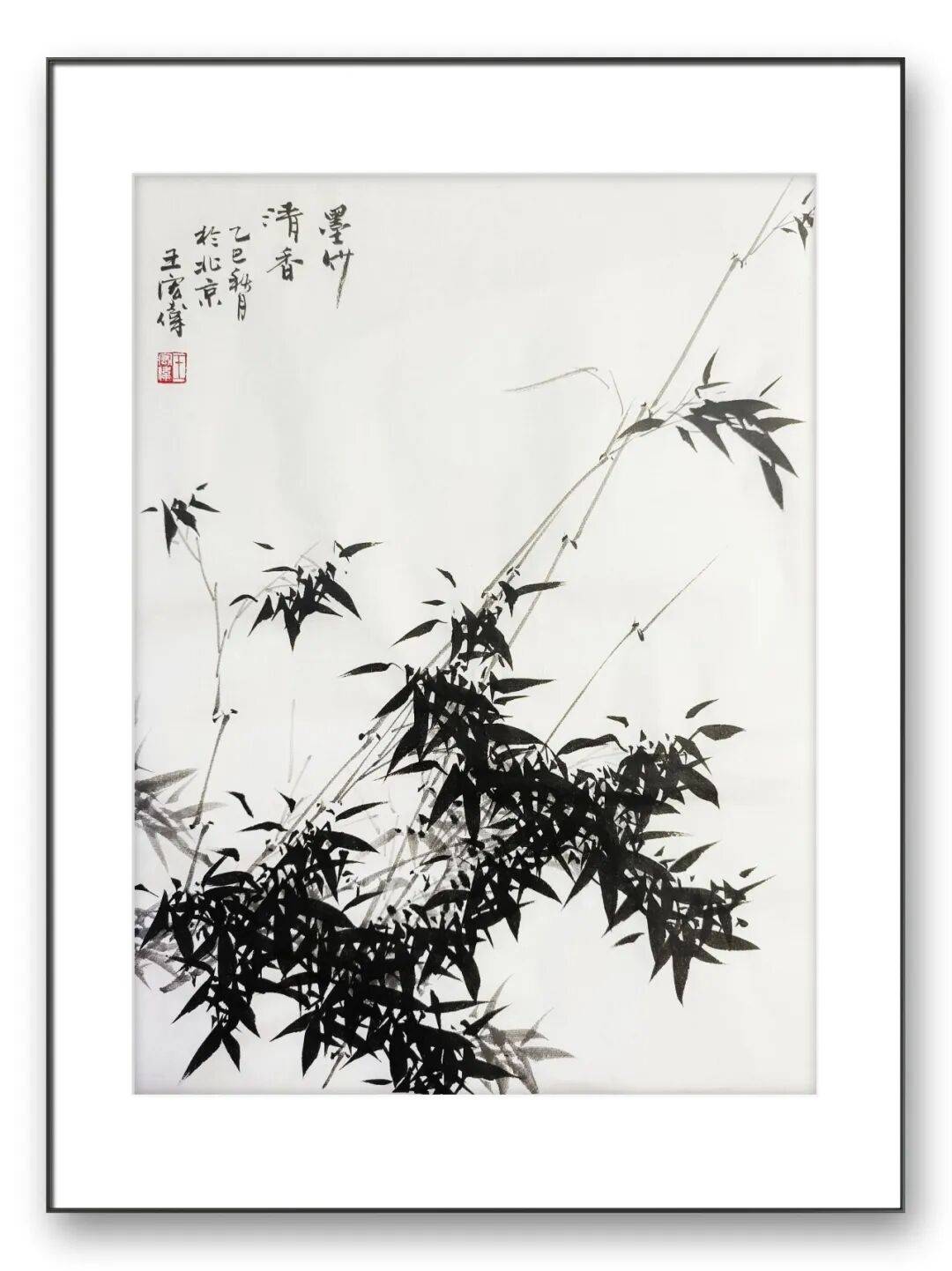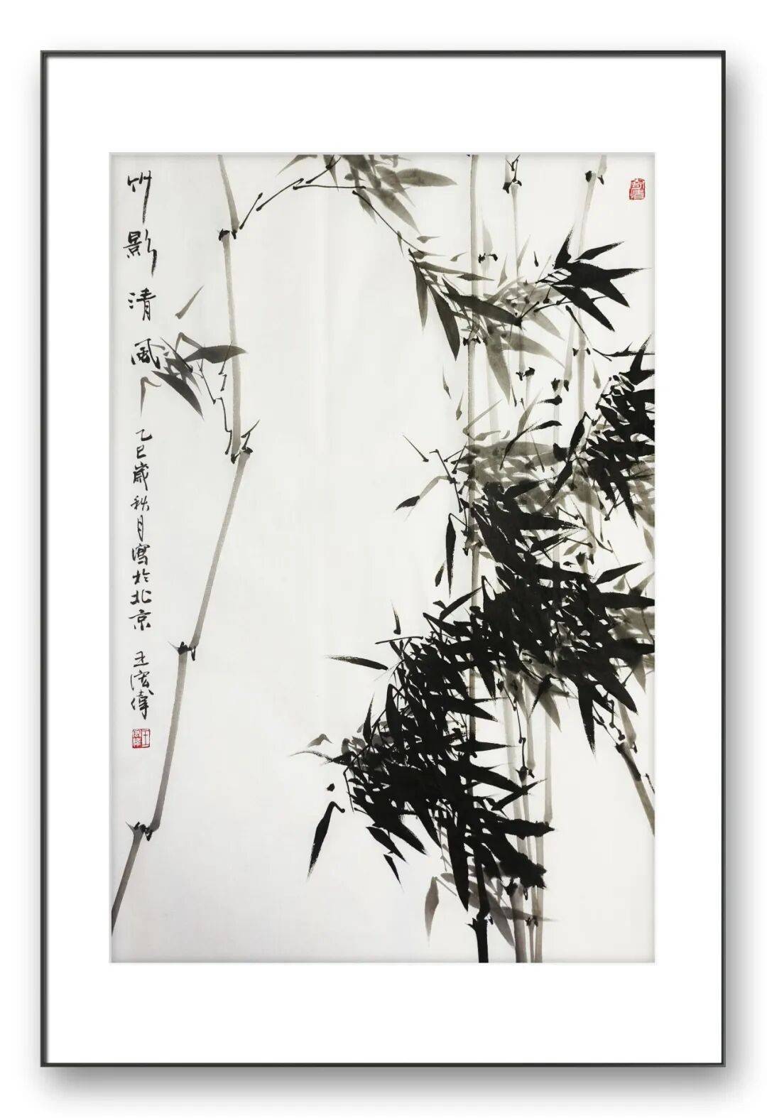 王宏伟的艺术根基,筑于“师古而不泥古”的扎实积淀。四十余年的创作生涯,他始终以临摹为阶,从历代画竹名家的笔墨中汲取养分。他深谙郑板桥“眼中之竹—胸中之竹—手中之竹”的创作哲学,先于传统法度中锤炼技法:以篆籀笔法勾勒竹枝,圆劲如铁尽显骨力;用飞白技法点染竹叶,飘逸灵动中藏墨色层次,将“墨分五色”的精髓融于笔端。不同于当下急于求成的浮躁风气,他沉心拜师学艺,在对古法的反复研习中,既规避了流于表面的程式化描摹,又摆脱了“骨多肉少”的技法局限,为自我风格的形成打下坚实根基。
