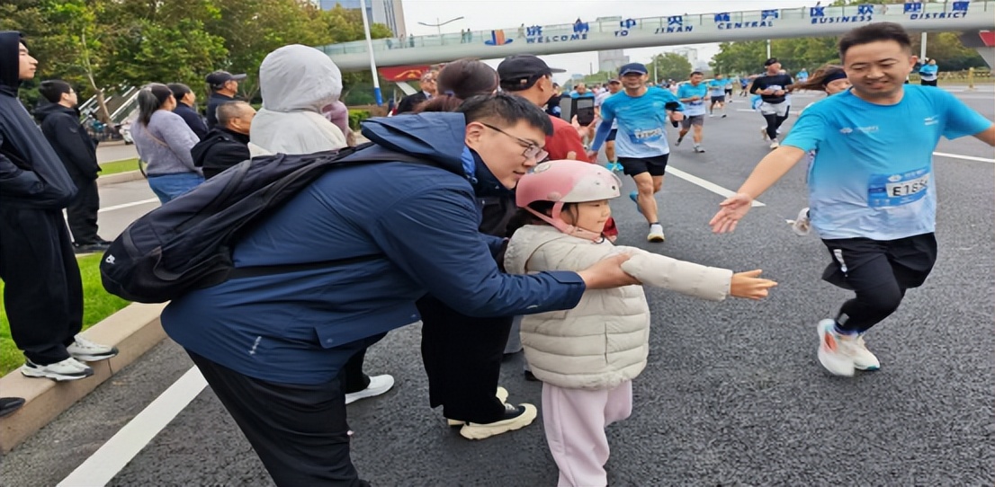 人群中有位五岁左右的小女孩格外引人注目——在爸爸的陪伴下,她一直踮着脚尖,认真地为每一位经过的跑者挥手鼓劲。那纯真而灿烂的笑容,仿佛一股清泉,为疲惫的运动员注入了新的力量。