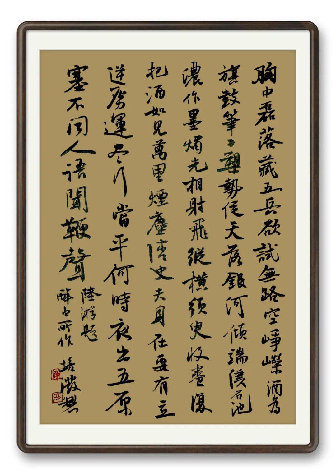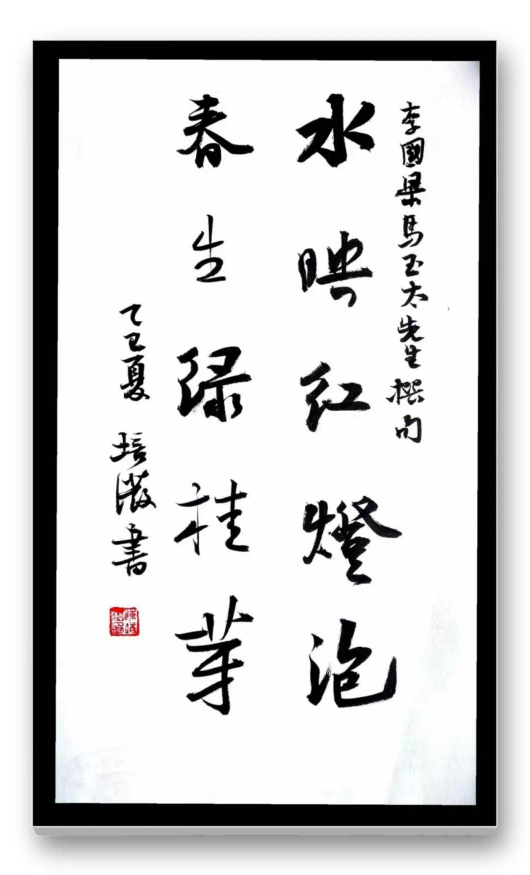 陈培泼先生的书法作品,在结构布局与笔墨运用上堪称精妙。他深谙书法是美学与哲学的融合之道,巧妙运用左右对仗、上下呼应之法,使整幅作品如和谐的乐章,奏响韵律之美。他将 “书法即诗、诗即书法” 的理念融入创作,字里行间,笔势呼应,气韵贯通,尽显对书法艺术的深刻理解与精湛掌控。其笔力雄健,如雷霆万钧,雄浑之势扑面而来;却又刚中带柔,苍劲线条中蕴含灵动之美,赋予文字鲜活的生命力,传递出蓬勃向上的精神气息与高雅的审美意趣。