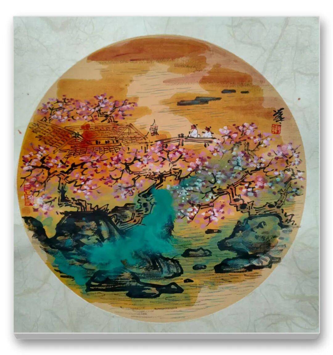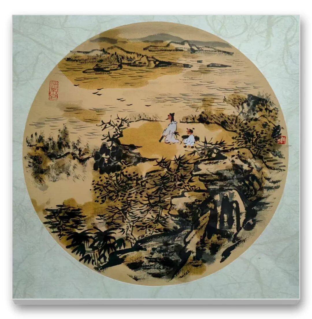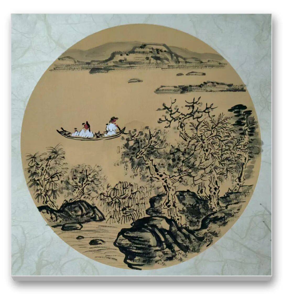 而其表现山水之清幽者,如诸多圆形扇面山水,更是别有一番意趣。画面常以山水、草木、屋舍、人物构成一方小世界,却在这小世界里营造出“小中见大”的深远意境。树木枝干虬曲,以简练而富有弹性的线条勾勒,尽显生机;山石造型奇崛,用墨或浓或淡,层次分明,似有温润质感;水面波纹轻浅,以细笔描绘,静中有动。偶有一人泛舟湖上,或于屋中闲坐,或在桥头伫立,人物虽小,却为画面增添了生活气息与人文温度,使这山水不再是冷漠的自然存在,而是充满了人的情感与意趣,宛如陶渊明笔下的世外桃源,让人心生向往,渴望投身其中,享受那份清幽与静谧。这种对“可居可游”之境的营造,正是中国山水画“以形媚道”精神的体现,韩长荣老师通过笔墨,将自己对理想生活与精神家园的追求,融入了这一方方山水之中。