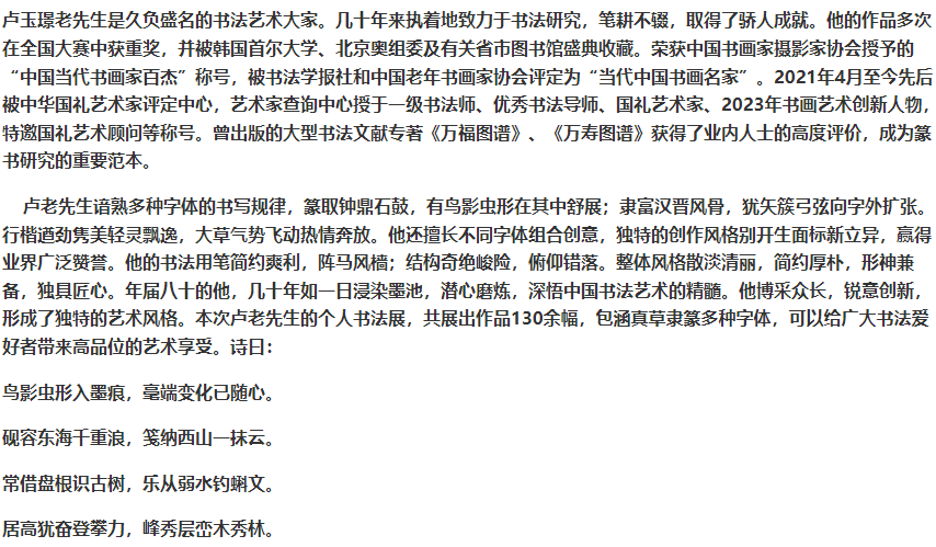 数十载书艺探索,卢老先生用笔墨书写了一段属于自己的艺术传奇。他的书法,是传统与创新的完美融合,是技艺与精神的高度统一,不仅为当代书坛增添了浓墨重彩的一笔,更为后人学习书法、传承与发展书法艺术,树立了光辉的典范。相信在未来,他的书法艺术将继续散发迷人的魅力,启迪更多书法爱好者与研究者,在书法艺术的天地里,追寻美与真理的永恒。