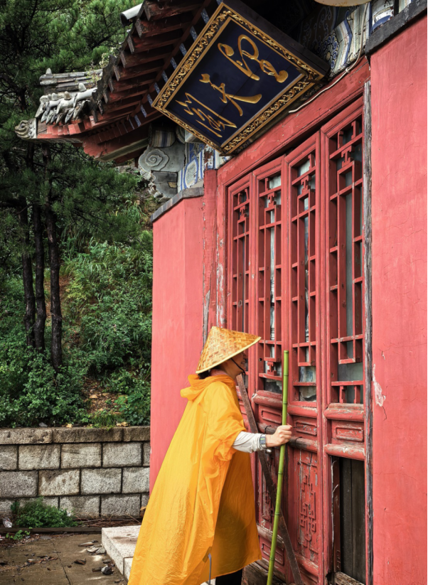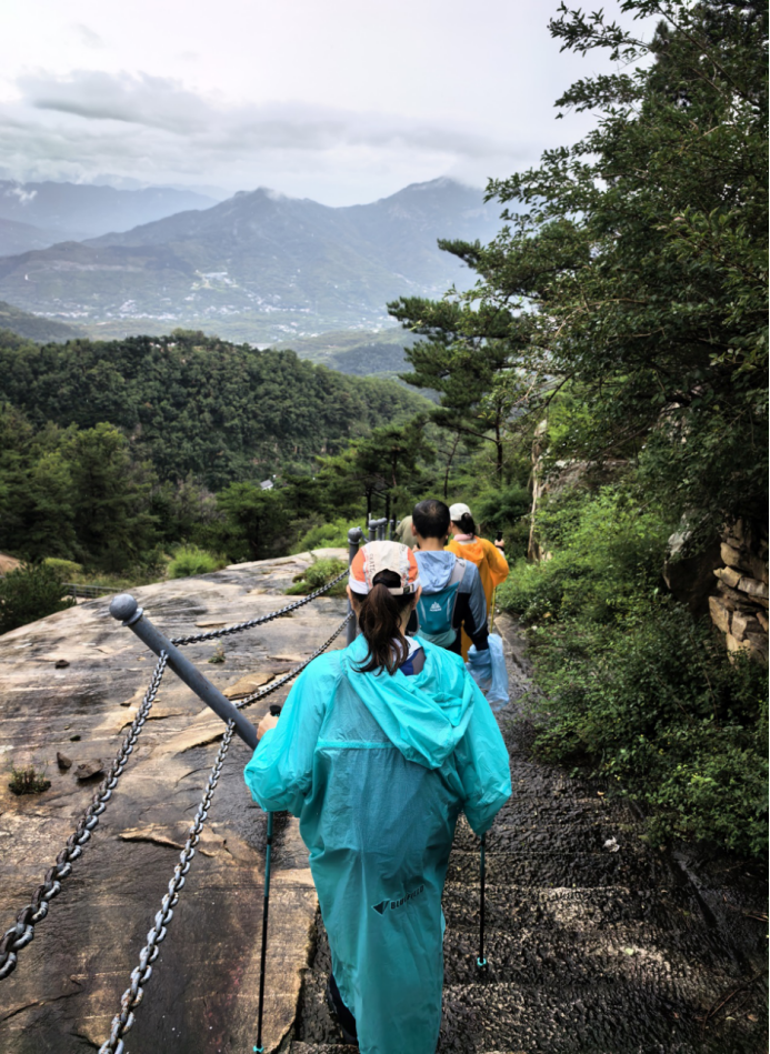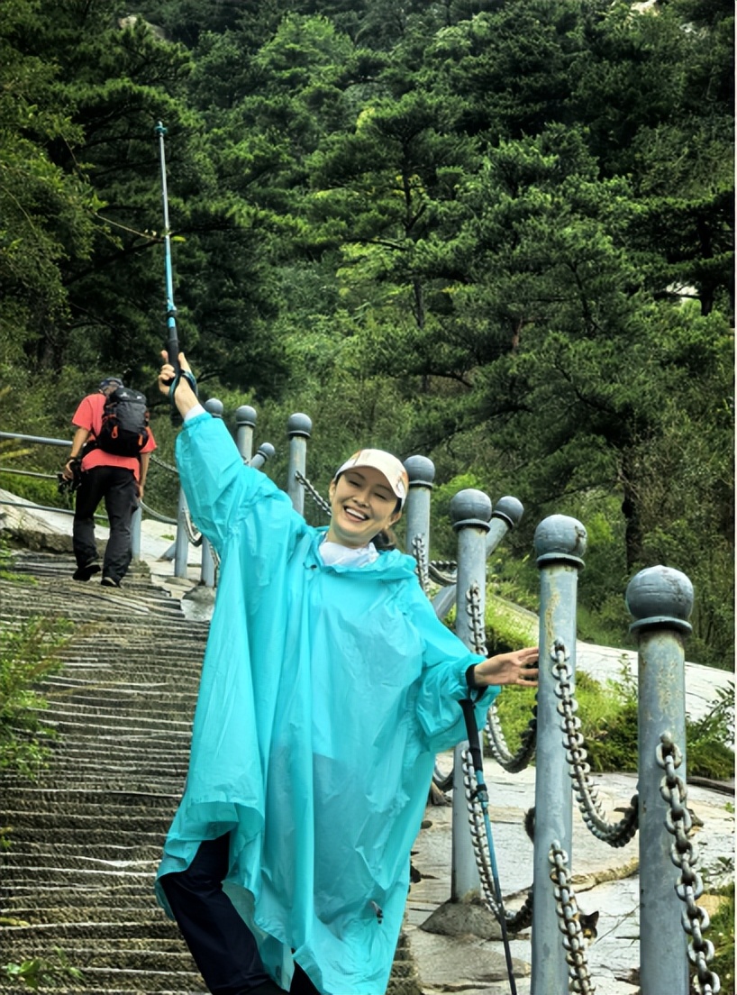 穿上红红绿绿的雨衣,美美们瞬间变成了一个个超人,行走在雨雾青山中,挥着登山杖前行,又像是一群要去山顶论剑的侠女。这是谁的弟子?难不成是清净散人孙不二的高徒!超然飘逸的身姿,真怀疑她们是穿越而来。拖在后面的俺,看到这唯美的画面,赶紧掏出手机记录。歪着头,用脖子夹住雨伞,双手举着手机拍摄,待感觉片片满意之时,方感到后背阵阵冰凉。原来那歪伞滑落的雨水,早已浸透了衣衫。