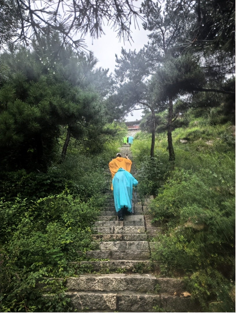 雨不停地下,根本没有止的意思,欣喜渐渐变成了惆怅及烦恼,总不能就在此观雨吧!郁闷之际,帽檐大哥打来了电话,询问位置所在。听闻因雨困在“东街”,随在电话中朗声说到:雨大莫急,小点再行不迟;我这有多余的雨具,需要时我返回送去。怎能让大哥返回送伞!看雨稍缓,大家都换好了雨衣,“花婆婆”也从车里翻出了雨伞,递到了俺的手上。有这还担心什么?走起!去尽情体验雨中爬泰山的乐趣吧!