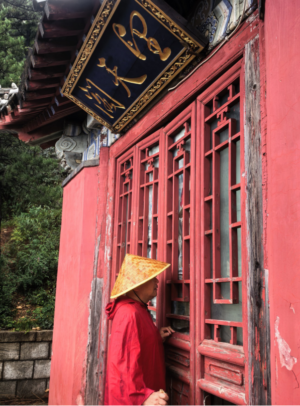 欣喜、向往中,7:30分来到“天烛峰”景区入口。走下车来,蒙蒙细雨竟变成了沥沥的小雨,那雨丝不一会就打湿了发丝、脸颊,“花婆婆、洋洋”等纷纷撑伞前行。小雨中登山,不正是喜欢和想象的样子吗!可从“东街”街口,还未走到“封禅颂”处,那雨就忽然由淅淅沥沥变成哗哗啦啦了,没有任何雨具的俺,很快就湿透了衣衫,无奈,几人只好在路边的屋檐下躲雨观山。