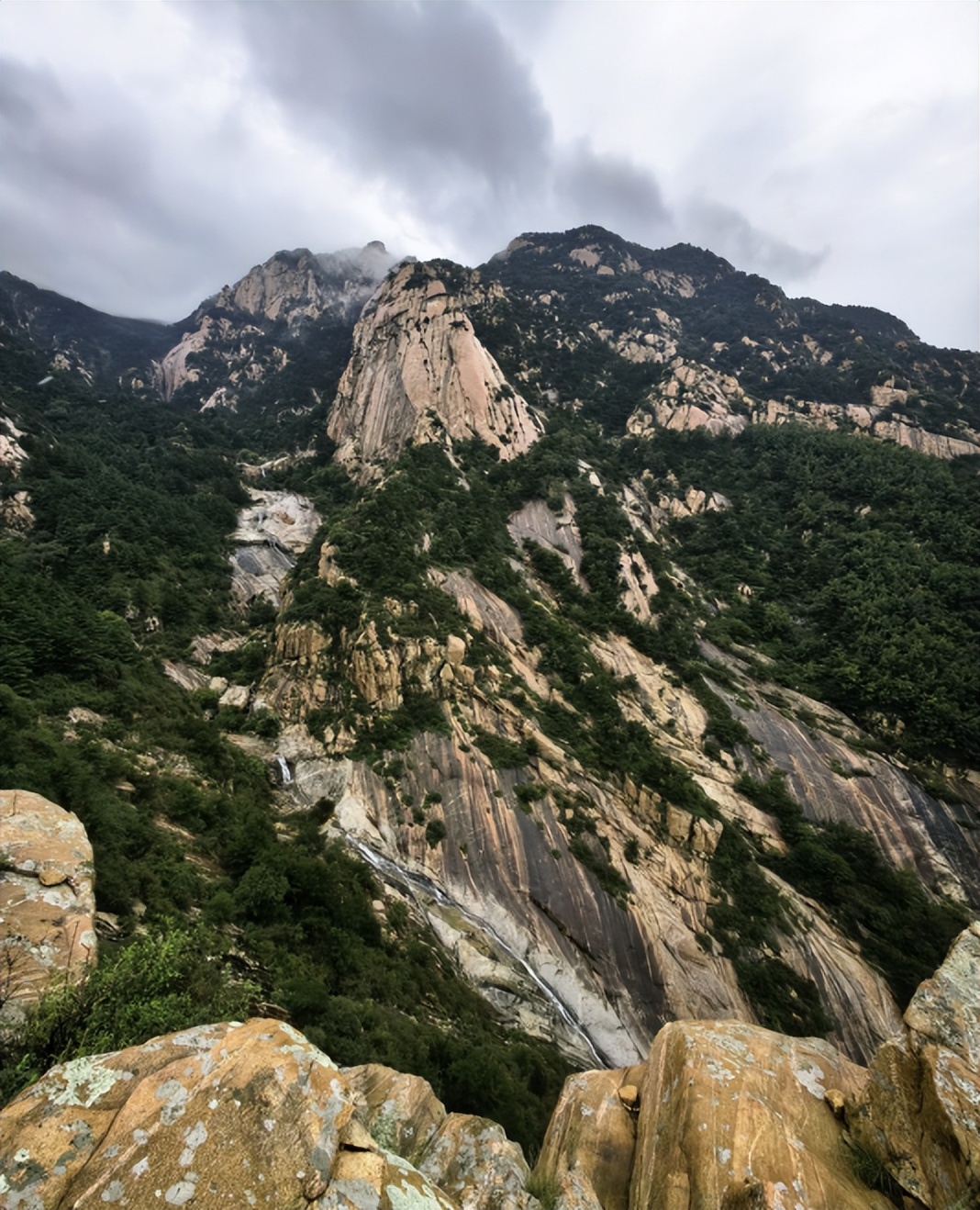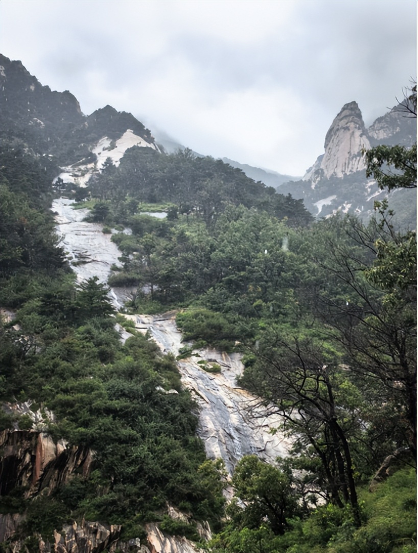 一路想象着“千尺瀑”该有的样子,健步跨上观景平台的那刻,眼前的景色还是让俺十分震惊。春夏秋冬来过数次,每次来都伫立许久,纵览周边美景。但遗憾的是,那最核心、最壮观的“千尺瀑”,却总是望不见丁点的影子。记得去年秋天前来,长长的上千米瀑布,连一滴水丝都望不见,黝黑的山体与周边大片枯死的松树,瞅一眼都让人心生寒意。而此时此刻,眼前的“千尺瀑”宛如一条白色巨龙,从陡峭的悬崖上飞泻而下,撞击在山涧的岩石上,绽放出朵朵圣洁的白花,水雾在空气中弥漫升腾,让人仿佛置身于仙境。那绵绵不绝、奔流不止的磅礴气势,那震耳欲聋、响彻云霄的声响,仿佛要将世间的一切烦恼都冲刷干净。沉浸在这样的美景中,心中除了惊喜,就是震撼。这雨中的“千尺瀑”,比以往任何时候都更加动人心魄。