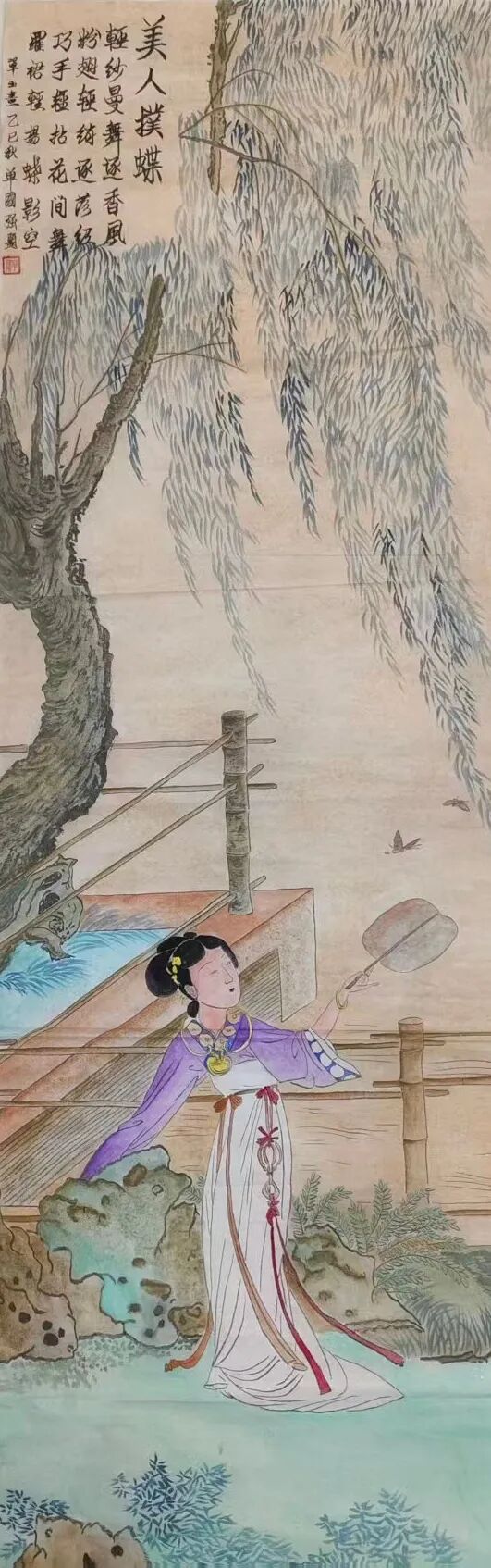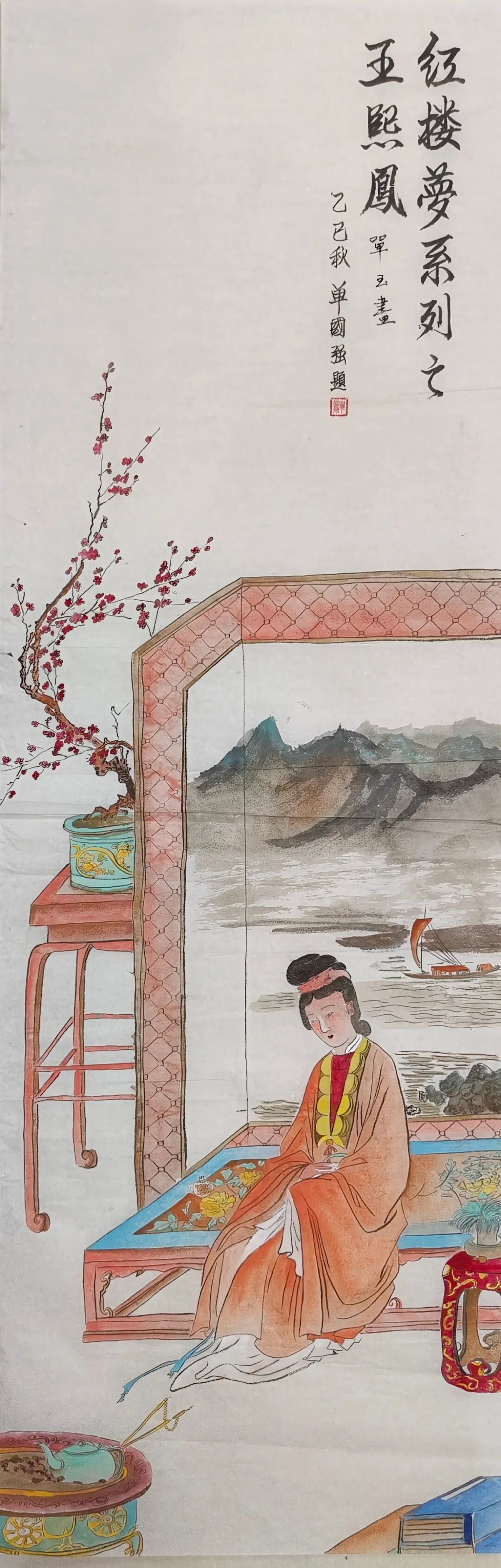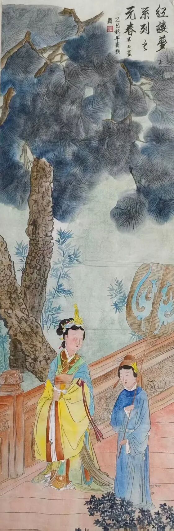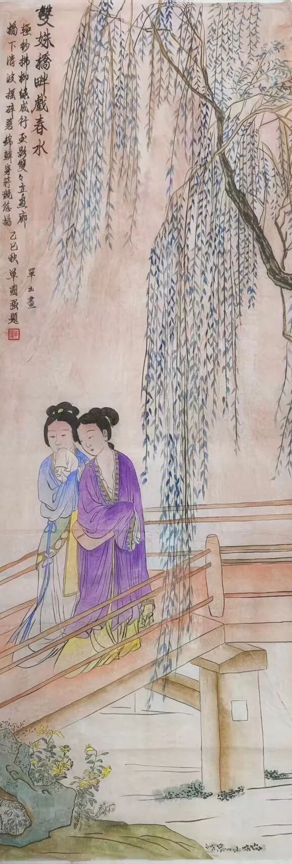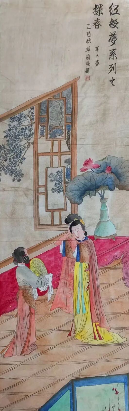 在“观艺术”创作维度,单玉秉持“守正不泥古”的哲思,让千年工笔技法迸发时代活力。她对传统技法的继承绝非复刻:《红楼梦》人物衣纹采用“高古游丝描”,却以更富弹性的线条节奏打破刻板感;设色遵循“随类赋彩”,又融入当代审美偏好的色彩层次——元春华服朱红更显厚重,惜春素衣月白更具通透,让古典人物在笔墨间“活”起来。