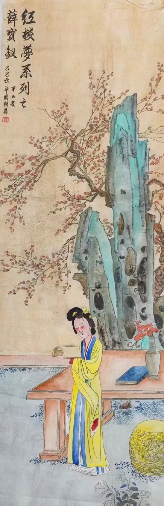 单玉的“观艺术”,首以评论为匙解锁工笔画的文化基因。面对《红楼梦》人物系列,她跳出技法表层,以“画文共生”构建解读逻辑:林黛玉的竹林布景,是“孤高品性”与“绛珠还泪”文学意象的视觉转译;薛宝钗的梅花点缀,成为“温厚沉稳”性格的笔墨注脚。衣饰纹样取舍与神态细微刻画,更串联起原著精神与工笔表达,让画作从“人物肖像”升华为“红楼文化当代载体”,尽显“以小见大”的文化格局。