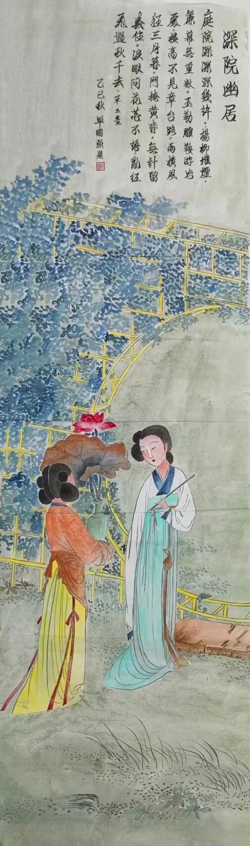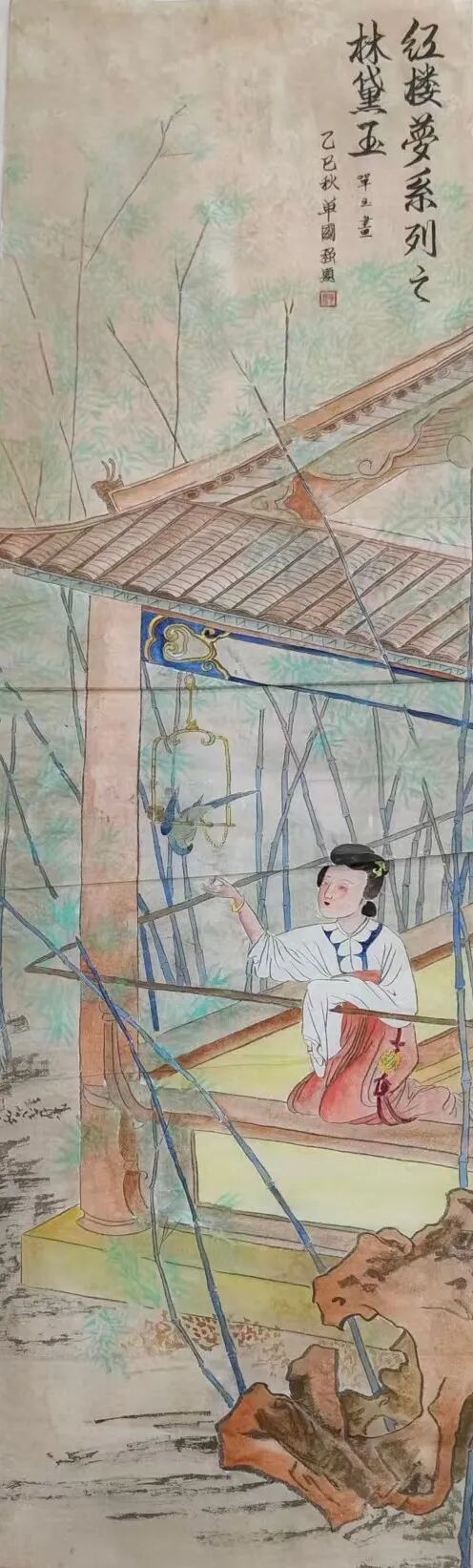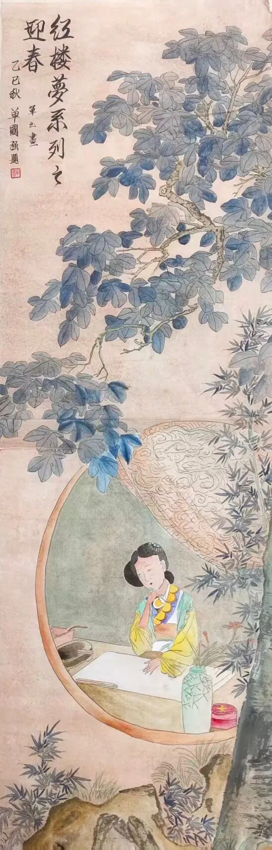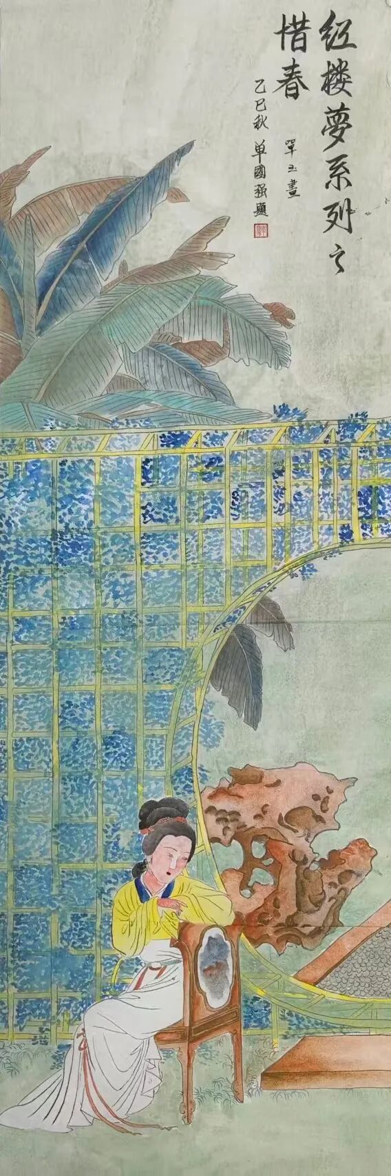 单玉的“观艺术”更以跨界素养,为工笔画注入多维审美意趣。她提出“工笔是视觉的韵律,是静态的舞蹈”,这一哲思在作品中处处可见:《林黛玉》图中竹林疏密排布,暗合古典音律“抑扬顿挫”,竹叶倾斜角度随画面节奏变化,如旋律般富有流动感;《惜春》图闺阁布局借鉴传统舞蹈“虚实相生”美学,桌椅留白与人物聚焦形成“动静对比”,让静态画面生出舞蹈般的空间叙事感。