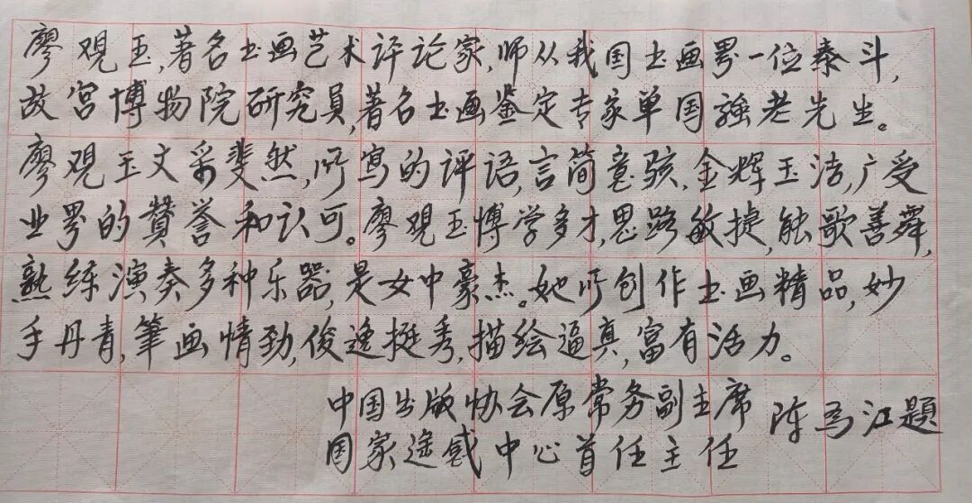 廖观玉,著名书画艺术评论家,书画家,书画鉴定家,师从我国书画界一位泰斗,故宮博物院研究員,著名玉画鉴定专家单国强老先生。廖观王文采斐然,所写的评语,言简意骇,金辉玉洁,广受业界的贊誉和认可。廖观王博学多才,思路敏捷,能歌善舞,熟练演奏多种乐器,是女中豪杰。她所创作出画精品,妙手丹青,筆画情劲,俊逸挺秀,描绘逼真,富有活力。