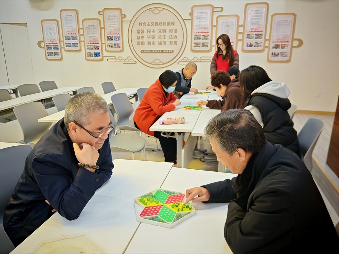 活动中,桌子上摆放着整齐的跳棋棋盘,五彩的玻璃珠在灯光下熠熠生辉。老人们陆续到来,相见甚欢,活动室内充满了欢声笑语,节日的喜庆气氛扑面而来。随着社区负责人宣布活动开始,老人们迅速进入“战斗”状态。他们或凝神沉思,谨慎布子;或眼疾手快,巧妙连跳。棋盘之上,红、黄、蓝、绿各色棋子化作灵动的精灵,在方寸格子间穿梭跳跃,勾勒出一幅幅精彩的“棋局风云图”。