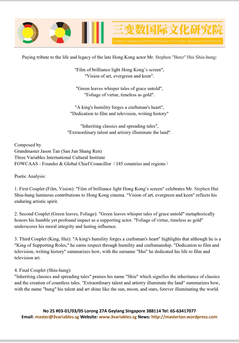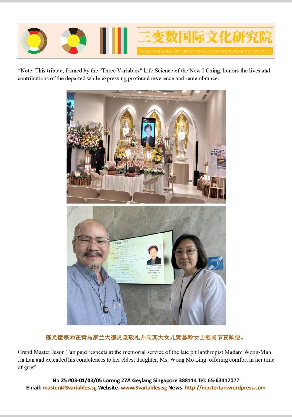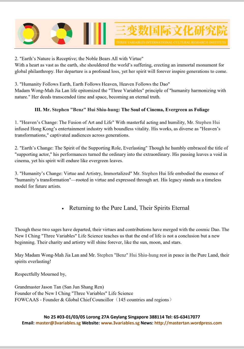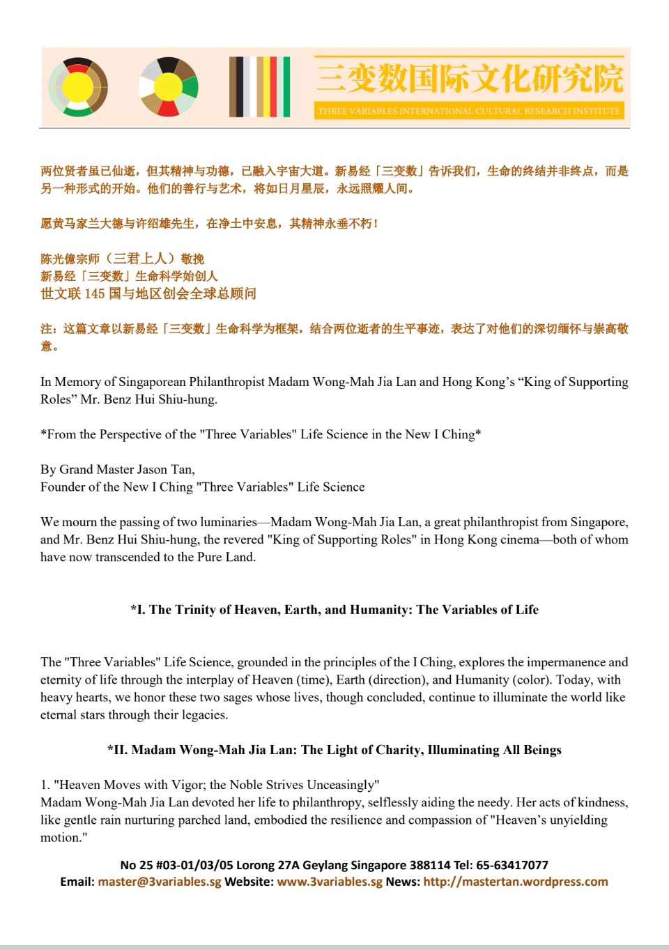 Founder of the New I Ching "Three Variables" Life Science, Grandmaster Jason Tan, Mourns and Commemorates Singapore's Great Philanthropist Madam Wong-Mah Jia Lan and Hong Kong Film and Television Supporting Actor Mr. Stephen "Benz" Hui Shiu-hung with Poems
