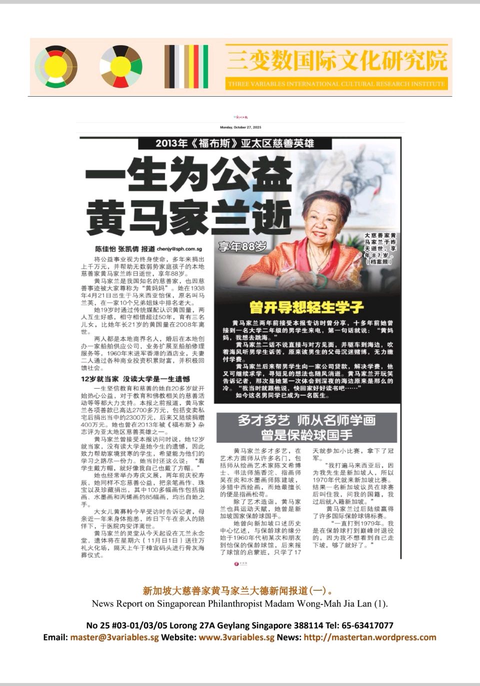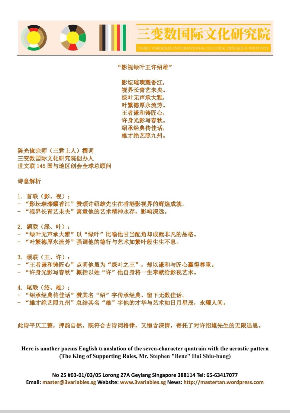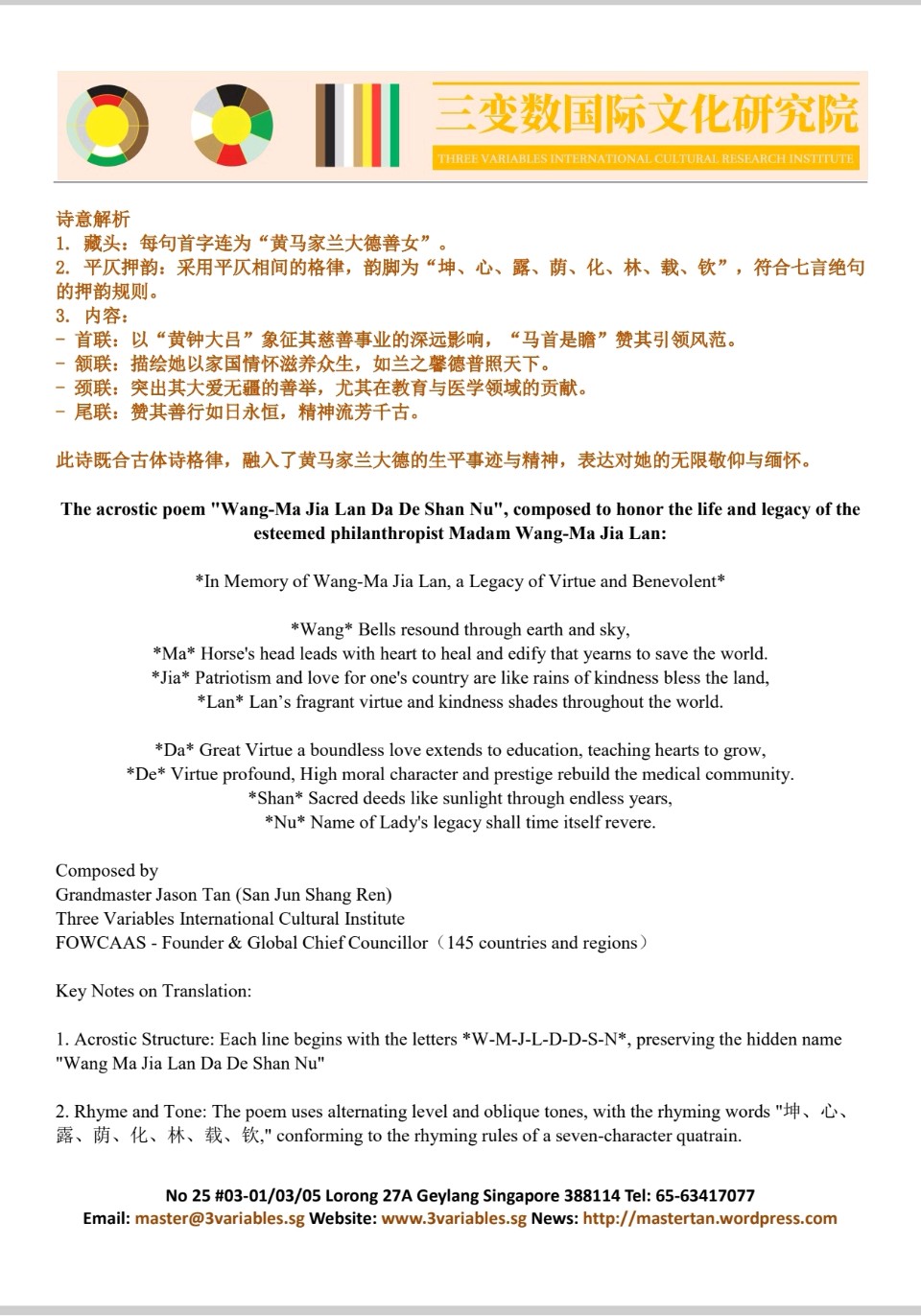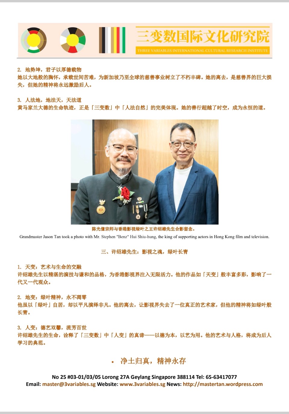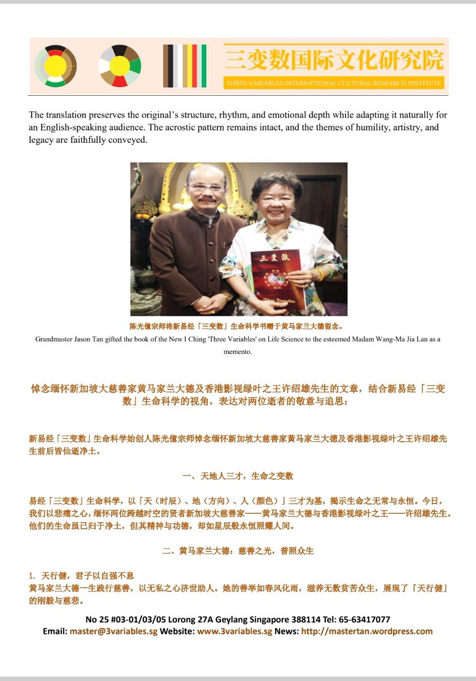 Founder of the New I Ching "Three Variables" Life Science, Grandmaster Jason Tan, Mourns and Commemorates Singapore's Great Philanthropist Madam Wong-Mah Jia Lan and Hong Kong Film and Television Supporting Actor Mr. Stephen "Benz" Hui Shiu-hung with Poems