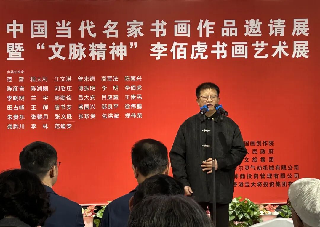 中国文化艺术发展促进会书记、副主席、原中国国家画院副院长、书法篆刻院院长曾来德先生代表中国文促会发表了重要讲话。浙江省原文联副主席、书记处书记柳国平、奉化区委常委、中共溪囗镇党委书记张义廉、浙江宁波佳尔灵气动机械有限公司总经理单谟君,宁波坤鼎股权投资管理有限公司总经理韩飞翔,中国香港宝大将投资集团有限公司董事长陈振江,各自发表了洋溢的讲话。中国海外控股集团党委书记:蔡彦君致辞。中国画创作院院长、中国文促会工艺美术专业委员会主任李佰虎致答谢辞。
