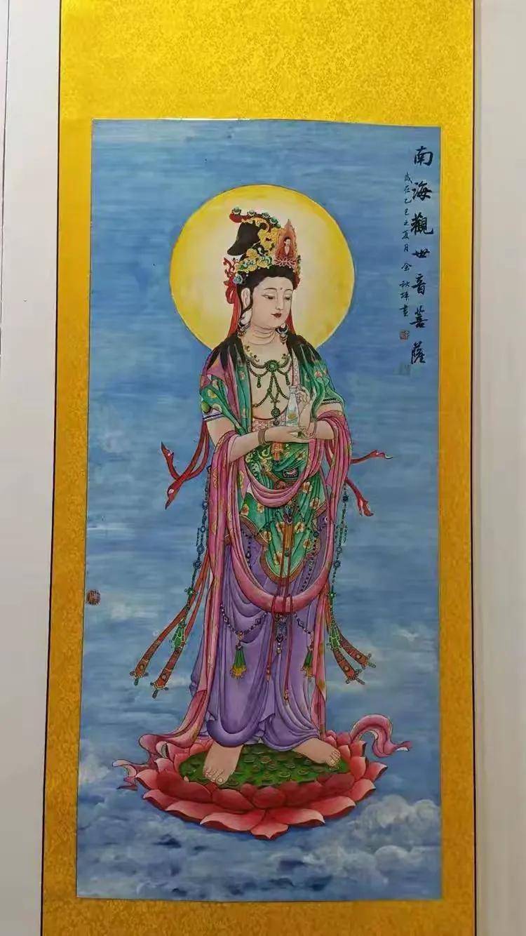 实力派画家余秋坪女士工笔人物画观音像《观音菩萨》图中观音大士笔墨刻画细腻,线条精致,画中的观音面露微笑,刻画出观者的庄严慈悲形象,韵味十足,有呼之欲出之效果,无尽震撼与崇敬令观者油然而生。作者将情感和笔墨相融合,观音上半身像神态自如,仪态端庄,心态怡然。观音形象在画家笔下生动形象地表现出来。而且观音寓意着平安、幸福,远离灾祸,有着美好、吉祥的寓意。是收藏悬挂的佳品,适合挂在茶室、财位、书房等地。