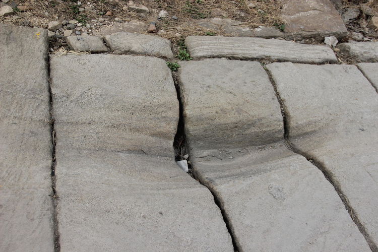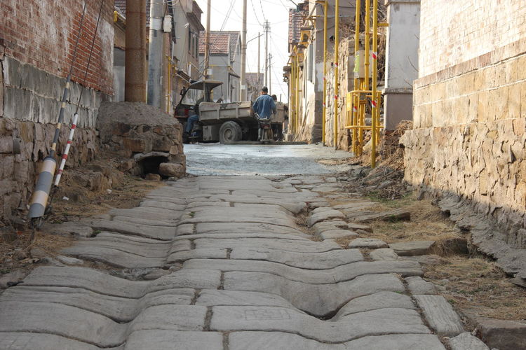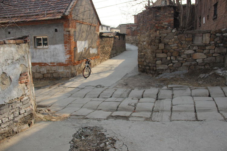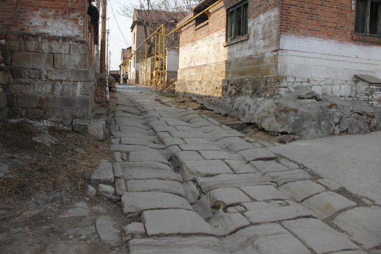 一个小斜坡,三五户人家,有一个岔路口向东去。中间地面上是用巨大的条石铺设的。长短的尺寸根据需要不太一致,但宽窄基本相同。两边还称有路牙石,这在现代看来也是很规范的建筑风格了。材质应该是石英石。不远处的山上就储藏了很多,就地取材了。