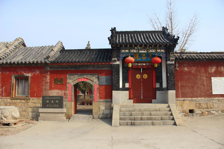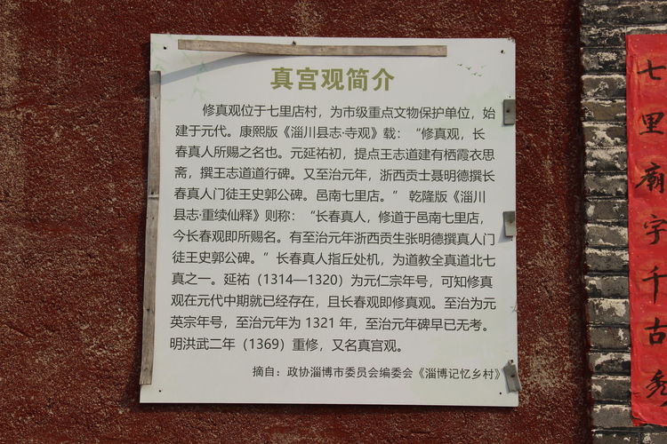 修真观位于七里店村,为市级重点文物保护单位,始建于元代。康熙版《淄川县志·寺观》载:“修真观,长春真人所赐之名也。元延祐初,提点王志道建有栖霞衣思斋,撰王志道道行碑。又至治元年,浙西贡士聂明德撰长春真人门徒王史郭公碑。邑南七里店。”乾隆版《淄川县志·重续仙释》则称:“长春真人,修道于邑南七里店,,今长春观即所赐名。有至治元年浙西贡生张明德撰真人门徒王史郭公碑。”长春真人指丘处机,为道教全真道北七真之一。延祐(1314-1320)为元仁宗年号,可知修真观在元代中期就已经存在,且长春观即修真观。至治为元英宗年号,至治元年为 1321 年,至治元年碑早已无考。明洪武二年(1369)重修,又名真宫观。