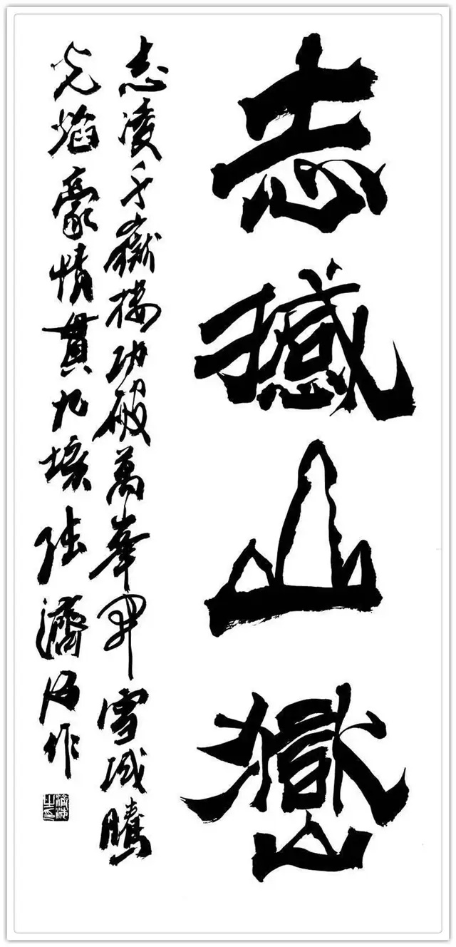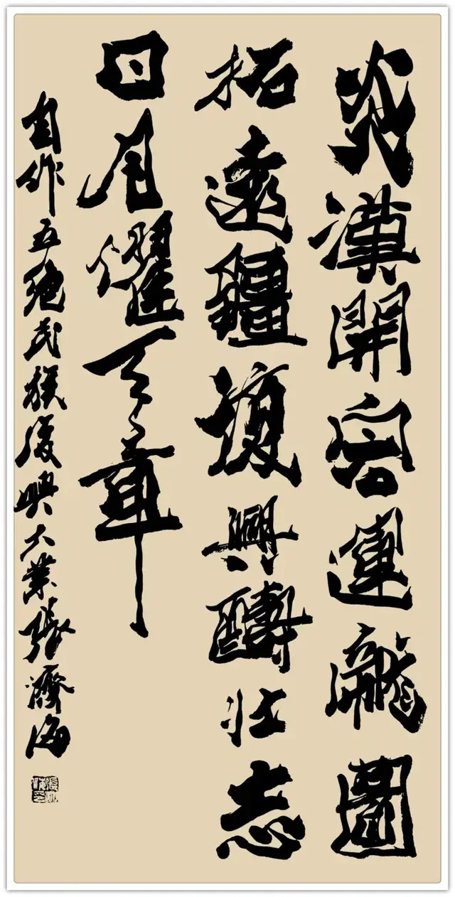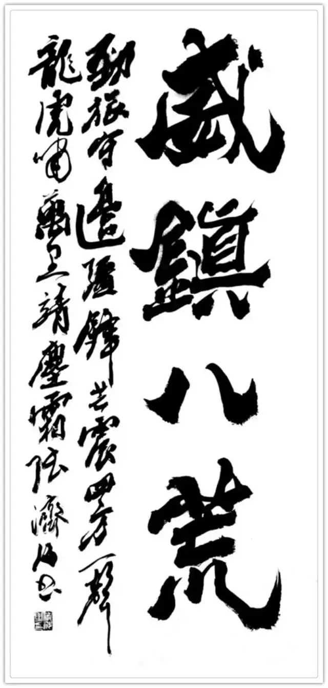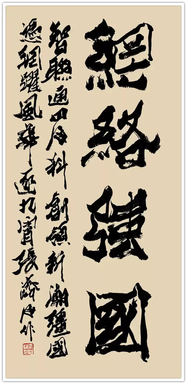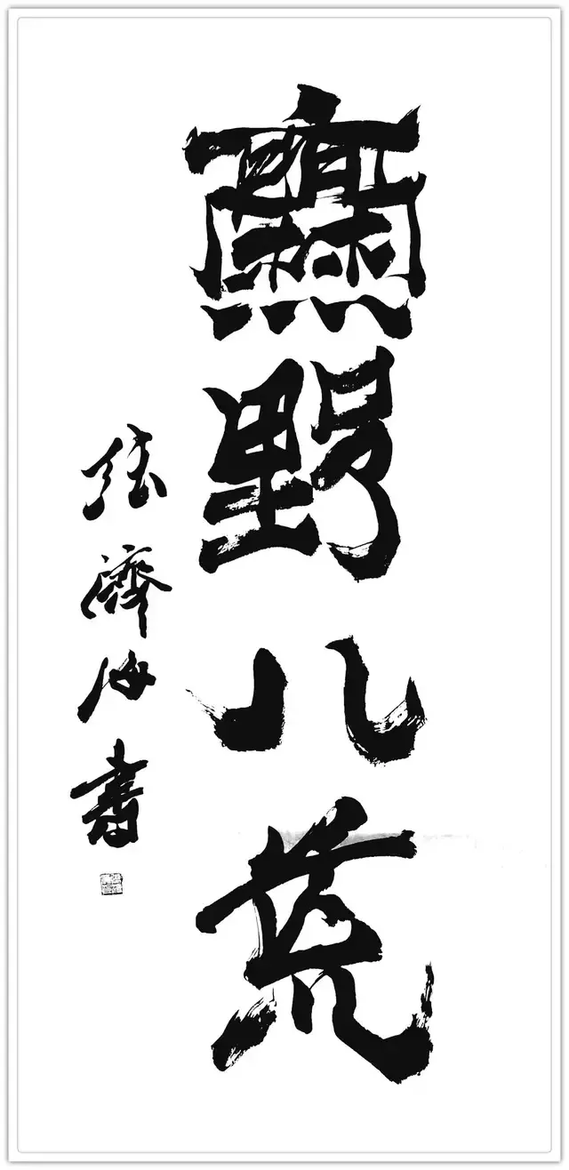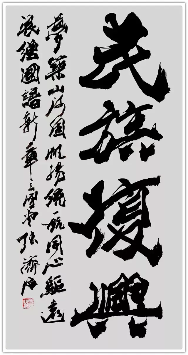军旅生涯的格局视野,赋予其书法“大气磅礴”的精神气象。军营中对“家国大义”的践行,让张济海的书法超越了单纯的笔墨技巧,承载起厚重的精神内涵。他提出“因义生情,由情赋形”的理论,书写时总能将家国情怀融入笔墨:为长城居庸关题写《厚德载物》时,笔势开阔如山河铺展;创作“中国风”时,结体恢弘似大国气象,字里行间皆是军人的家国担当。这种格局并非一日养成,而是长期军旅生活中集体主义精神的积淀——正如军营中“舍小我为大我”的信念,他的书法早已跳出书斋小趣,成为民族精神的视觉载体。