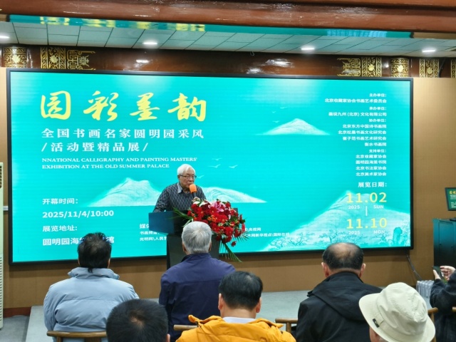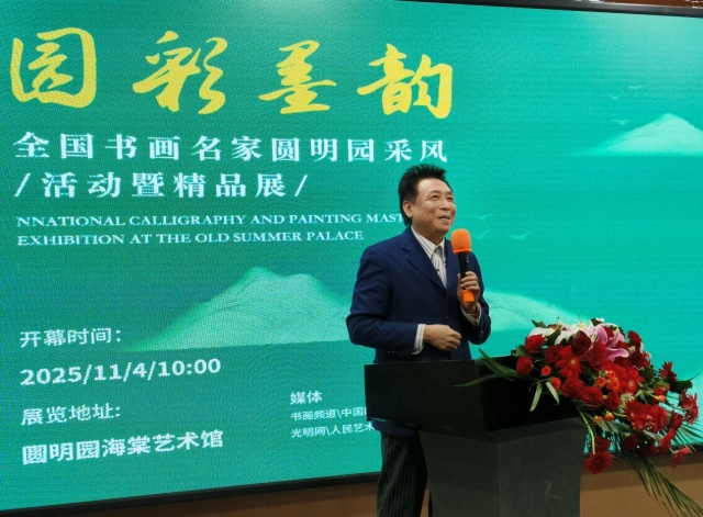 “圆明三园映日辉,万木葱茏绕翠微”.11月4日,由北京收藏家协会书画艺术委员会主办;画说九州 (北京) 文化有限公司承办;圆明园海棠书院支持;北京东方中国诗书画院、北京松晨书画文化研究会、崔子范书画艺术研究会、衡水书画院协办的第二届“园彩墨韵·全国书画名家圆明园采风活动暨精品展”在北京圆明园海棠书院隆重开幕。展览一共展出58幅精美力作,艺术家们通过手中的笔墨再现圆明园昔日的辉煌,展现了书画艺术在新时代的生命力与创造力。国务院政策研究室原副主任、中国东方文化研究会榜书艺术委员会名誉会长于赋;故宫博物院专家单国强;国家级中国茶文化首席非遗传承人、中国茶文化研究院院长罗大友;中国美术家协会理事、中国书法家协会理事 、西泠印社理事容铁;中国书法家协会理事、北京书法家协会副主席田伯平;中国美术家协会理事胡宝利;北京中国画研究会副会长,美术理论家张守涛等嘉宾出席开幕式并致辞。华夏文化促进会副会长、中国国家博物馆馆员张金卫主持开幕式。