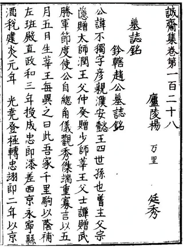 公讳不独,字彦亲。濮安懿王A①四世孙也。曾王父②宗隐,赠太师、润王。王③父仲癸,赠少师、辛王④,父士谭,赠武胜军节度使。公自总角⑤仪观秀杰,端重寡言。以五月五日生,莘王每异之曰:“此吾家千里驹。”以荫⑥补左班殿直。⑦政和⑧三年,授成忠郎⑨,添差⑩西京永宁县酒税B①。建炎②元年,光尧③登极,转忠翊郎④,二年以京西北路制置司辟命⑤,权知⑥西京永宁县事,兼总辖軍马。时胡骑南牧⑦,所在盗起,永宁当贼冲,公毅然以维城为己任,缮修战械,峙粮立壁⑧,振作士气。屡立战功。邻邑相继不守,公境独全。绍兴三年,内外阻绝,西京遂陷。公与弟不庶、不忙,率公族及乡里豪杰,各堑山为砦以拒贼。来则御,去则袭。一日,伪齐步军太尉王胜大军倏至,远近震拢,公挺身与战,屡㨗。七年⑨粮尽援绝,势不能复支,遂率所部数千人南归。天子嘉叹!赉予优渥⑩,特转四官,令吏部授优异职。未几,转武节郎C①,授建康府兵马都监。制曰:“赵某忠义可嘉。″又曰:“以劝臣节。”公在建康,威名焯著,盗敚②屏迹。留守晁谱之倡诸公间③论荐④,章⑤交公车⑥,转⑦武功郎⑧,历抚、吉、南康、临江兵马都监⑨,官吉者再。公屡总材官,习熟李法⑩,操切吏士,威信斩斩,匹马夕掫,狱市宁壹。偷儿D①相戒曰:“是尝赤手执虏,何可犯也!″三十年,转武翼大夫②,衡州兵马钤辖③。上即位,转武经大夫,主管台州崇道观。后转武节大夫,吉州兵马钤辖。再迁武德大夫。尧光圣寿七十湛恩④,转武功大夫。公虽帝王子孙,而少历行阵,精骑射,善用兵,孙吴之书⑤,口讲心计,洞达⑥奇正,沈涵⑦策谋,临机料敌,冰解雪释。每诵贾生语曰:“何不试臣为属国,请必系单于,笞中行悦⑧,”辄太息北向,发上冲冠。及南北罢兵,公亦老矣。戎马之气浣以诗书,群居燕间⑨,黄帽野服,投壶奕棋,一觴一咏,市书充栋,用训子弟。风流文雅,翩翩佳公子也。天性仁厚,方⑩在洛,金虏所过必屠,遗胔E①横道,公见之,躬取蔂梩②掩之。虽在兵间,不忘爱物,严不重伤③,胜不多杀。晚喜浮屠④旸⑤爽盥漱,清坐斋如,诵其语必万周。淳熙三年九月辛未卒,年七十一。十一月某日,葬于吉州城北螺子山女冠平之原。配徐氏,累封安人⑧。男善撙,秉义郎,监潭州南岳庙。皆先公卒。女二人,长适成忠郎、新岳州平江巡检管镕,次早世。孙男四人:长曰汝弼,承节郎,新监潭州南岳庙。次曰汝谐、汝贤、汝翼,皆以公荫补官。孙女四人,长适李纯,次许嫁徐洪、王珏、王希尹。汝弼以公族子善滂所论次行实来谒铭,铭曰: