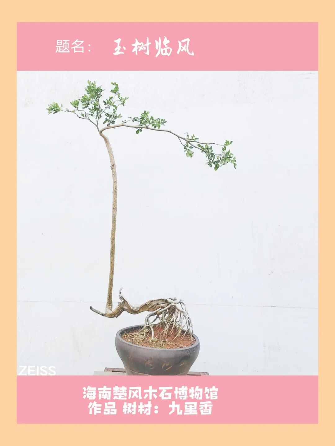 注:香九里。此作树材为九里香,岭南盆景七大材料之一。花开时节,香飘九里。