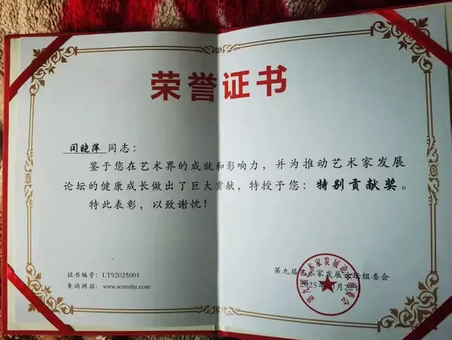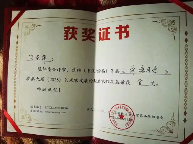 2025年作品《荷塘月色》获第九届艺术家发展论坛名家作品展金奖。鉴于其在艺术界的成就与影响力,并为艺术家发展论坛的健康与成长做出了巨大贡献,荣获特殊贡献奖。