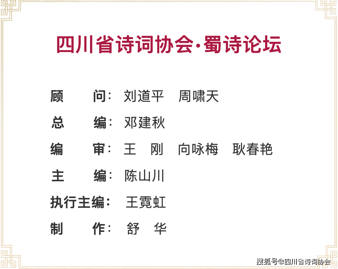 孟大川,法学教授,在职律师。中华诗词学会会员,四川省诗词协会监事长,四川省摄影家协会会员 。诗词在《诗刊》《中华诗词》《中华辞赋》《星星》《岷峨诗稿》等刊和网络平台均有发表。出版有诗集《鱼凫格律》、散文集《鱼凫絮语》、法学专著《基层法治政府建设研究》等及编著多部。主持完成国家和省部级社科基金课题共5项,获省级政府优秀成果奖共13项。