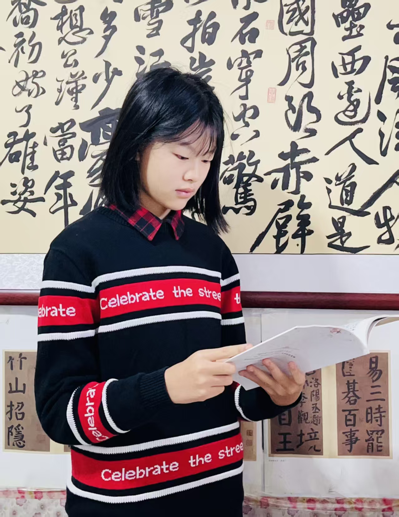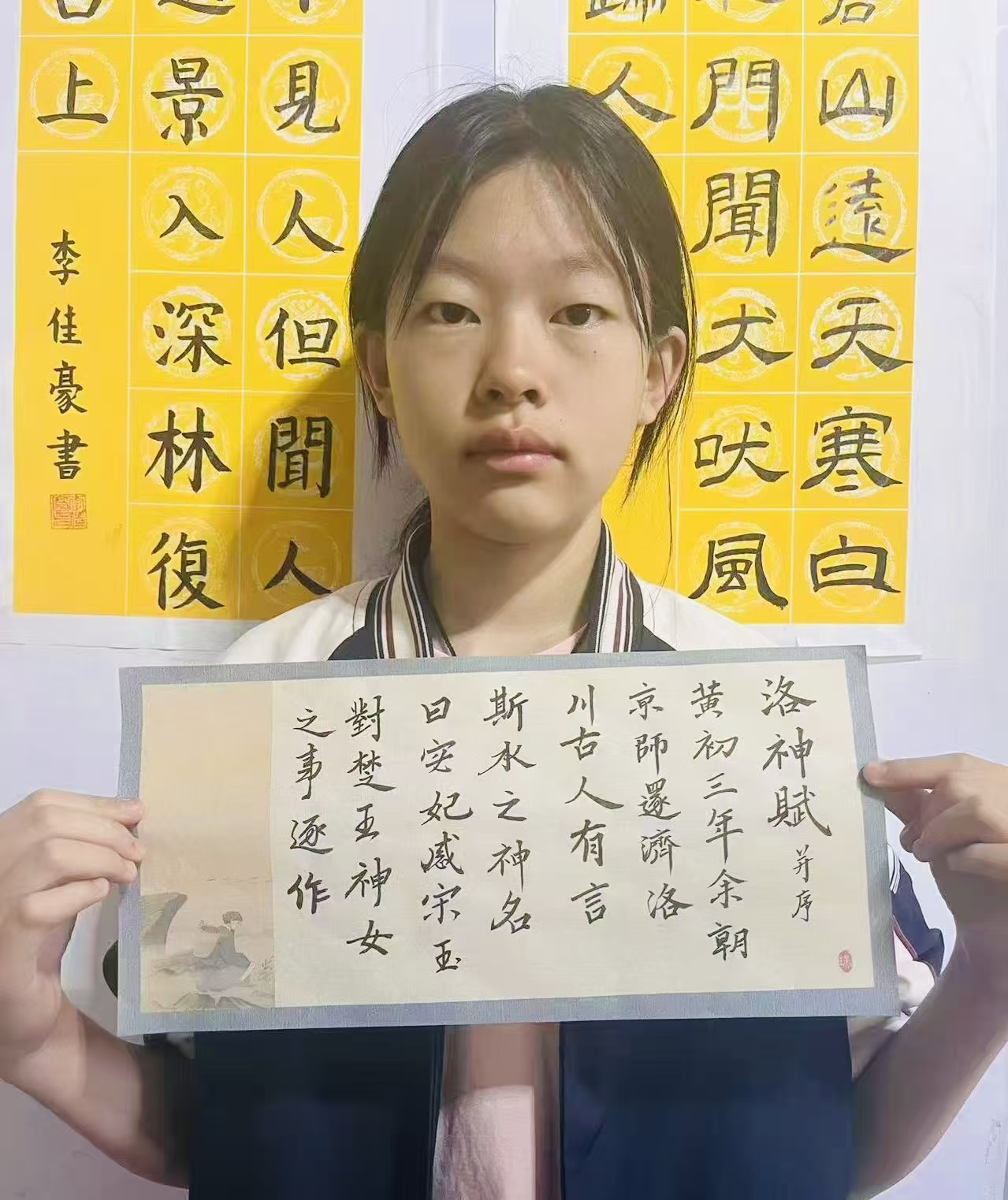 这就是我心目中的高绮晗,也是文轩书院的得意门生。愿这份对书法的热枕,永远写进你的心里,去静静地感悟中国书法千年的美,只有在绮晗的身上,才有文人雅士的气韵。这种气韵长长的,像一个唐朝穿越而来的芊芊女子,静静的等候,等一场翰墨飘香的盛宴即将到来。