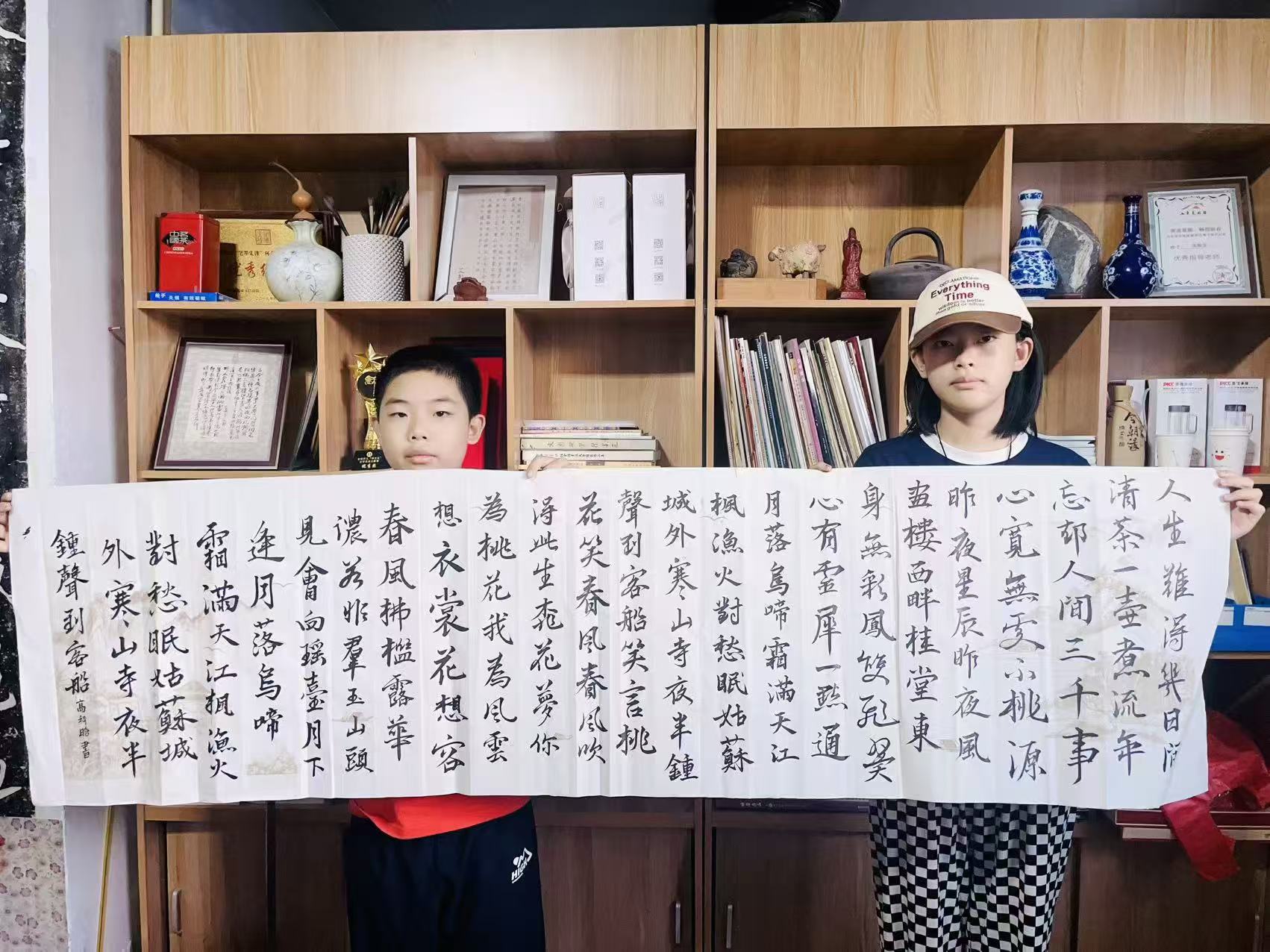 她的安静不是无声的,宣纸上的笔锋擦过纸面时,那是墨色温润后的一枝桂香,是深秋熟透的果实。当写到“心有山海”时,她的发梢垂下来,扫过纸边墨痕却有声。我知道,这些年她对书法的喜欢,都藏在字的热爱里。她妈妈来接她时,她会把刚干的作品整理好,这种仔细的态度,持续了好几年。难忘翰墨如诗,句句精彩。