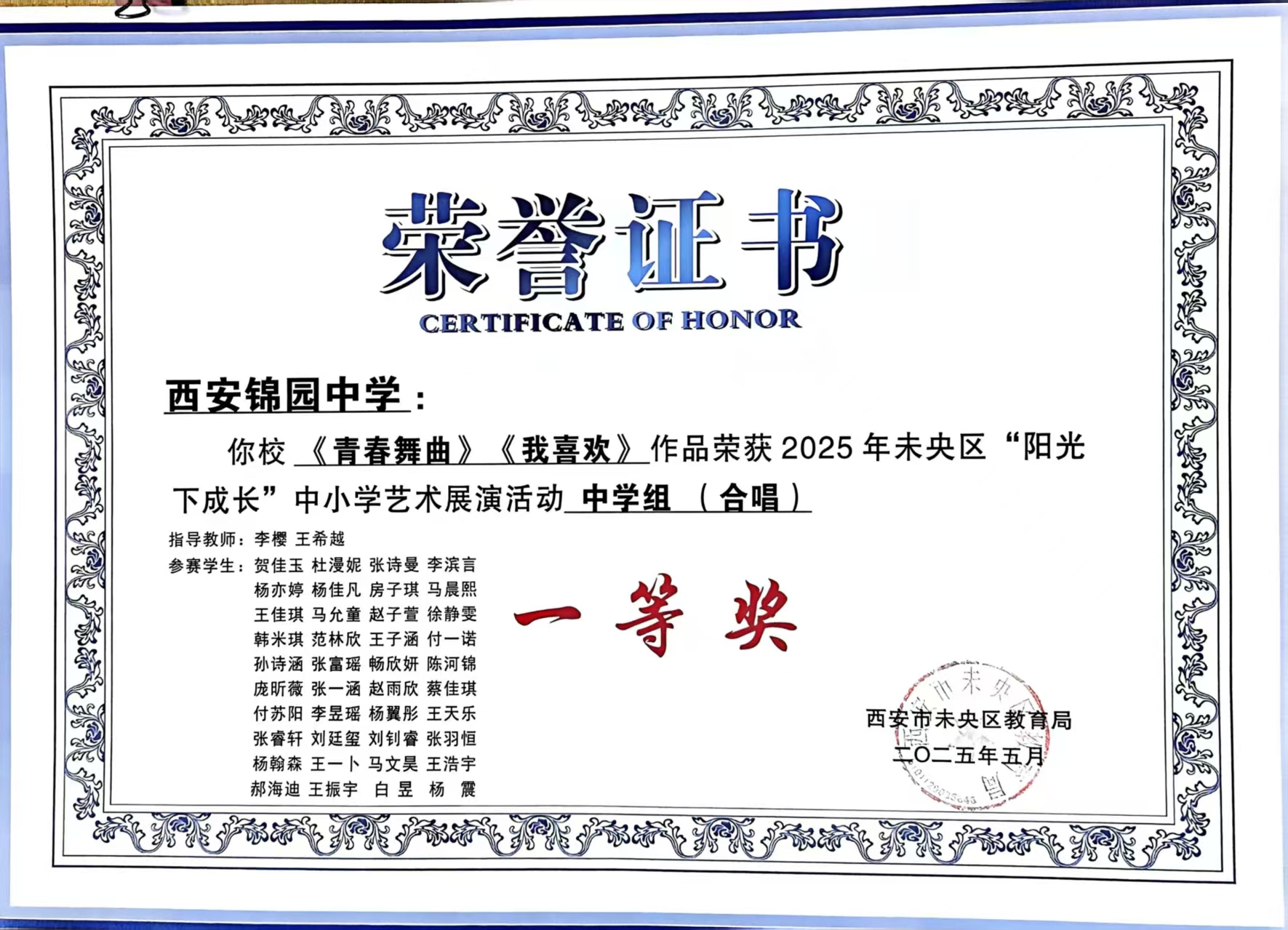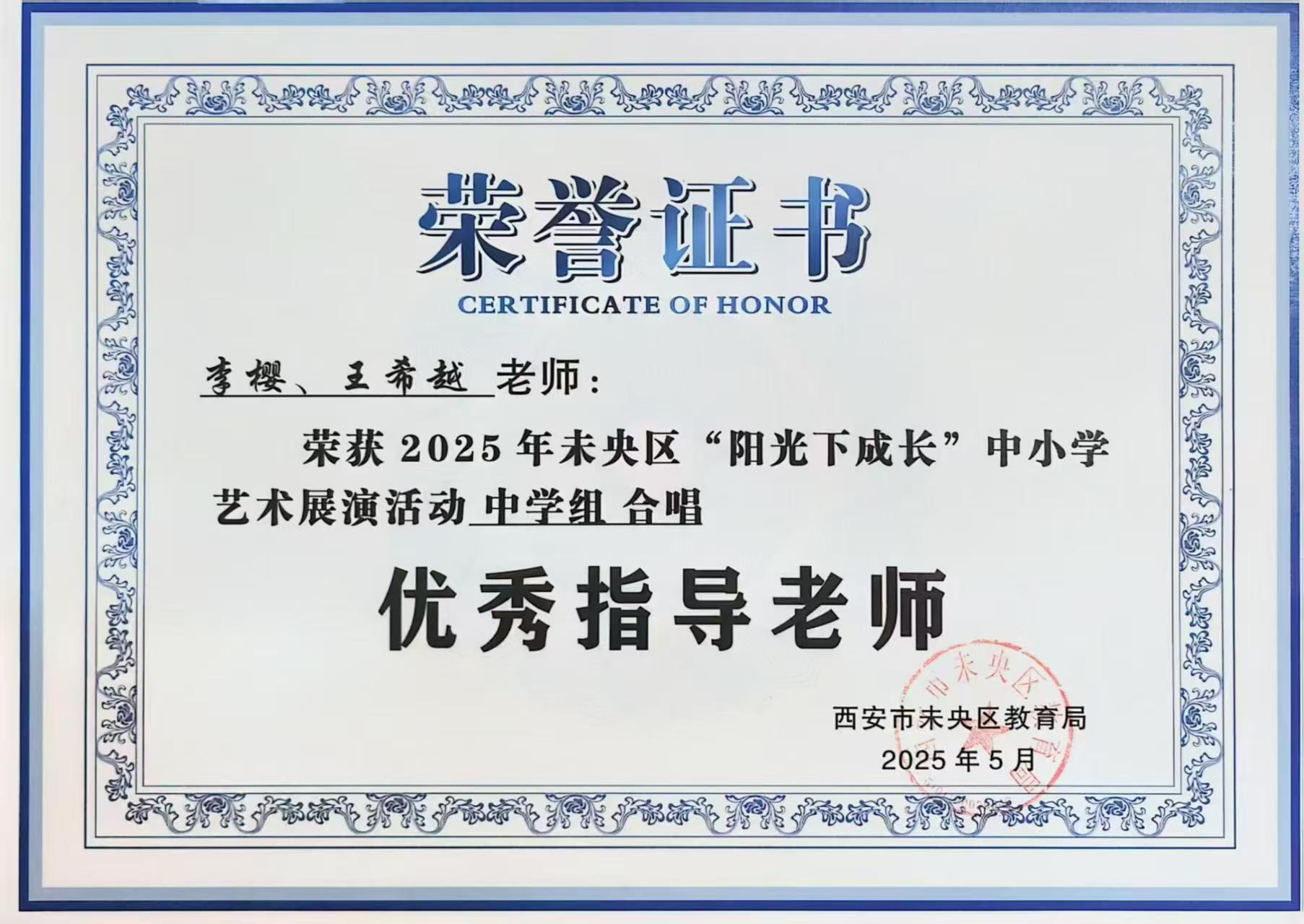 美育是立德树人的重要载体,是滋养学生心灵、培育全面发展人才的关键抓手。今年4月,2025年未央区中小学“阳光下成长”艺术展演中,西安锦园中学教师李樱与王希越联合指导的合唱作品《青春舞曲》《我喜欢》凭借精湛艺术呈现、饱满情感表达脱颖而出,斩获中学组合唱一等奖,李樱同步获评中学组合唱优秀指导教师,用匠心坚守书写美育育人新篇章。