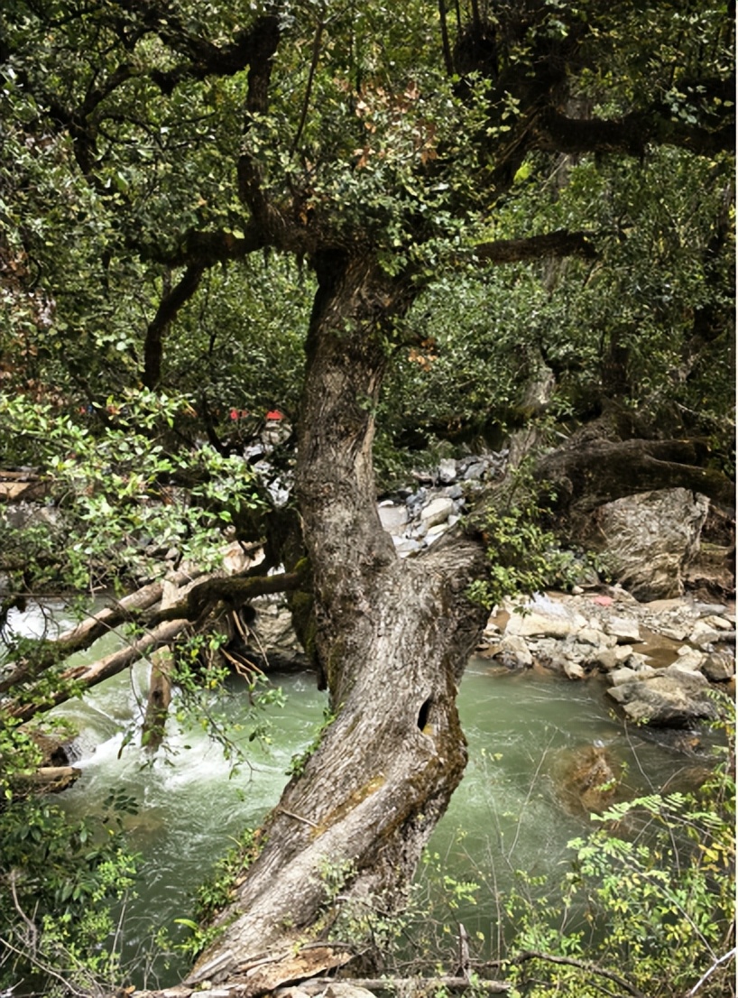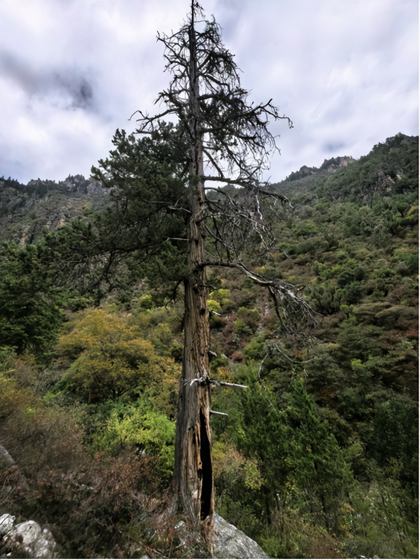 小路开始转弯上行,渐渐进入原始森林,眼前不时冒出一棵棵粗壮高大的杉树。路旁崖边一棵笔直干枯的云杉,让你忍不住驻足。这树不知经过了多少的风雨雷电,苍老的树干底部已成空洞,遒劲的枝干大多枯死,但仍有枝干缀满翠绿的叶片,顽强不屈的生命力,实在令人赞叹!