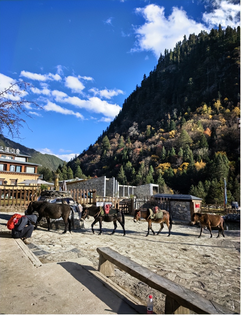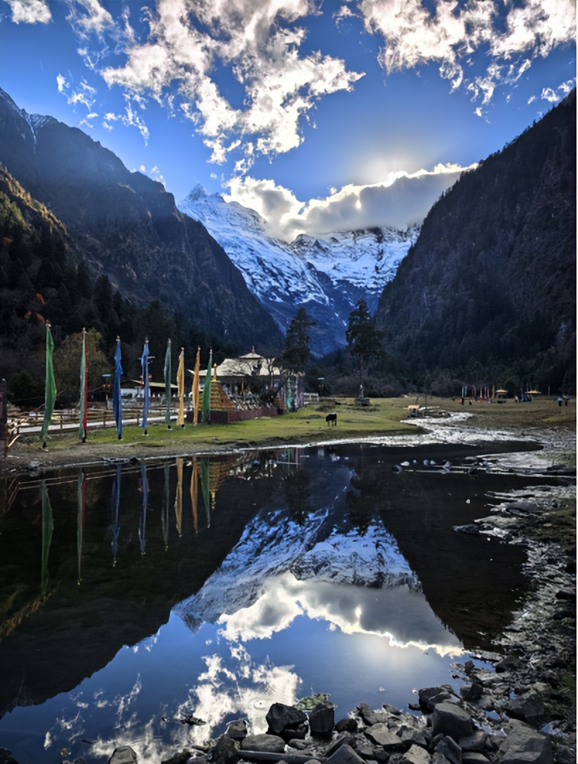 瞅一眼悠闲的牦牛,在白塔旁静静伫立;摘一片金色的叶片,观四周斑斓金秋;听骡铃叮当,恍若梦境。取下背包,一屁股坐在客栈前的木板上,任阳光抚摸;望着眼前飘扬的经幡,神秘的玛尼堆,木屋、石墙、柴堆……,远处及水中倒影的雪山,那一刻醉了,真的醉了!好想好想,就这样一直地醉下去……