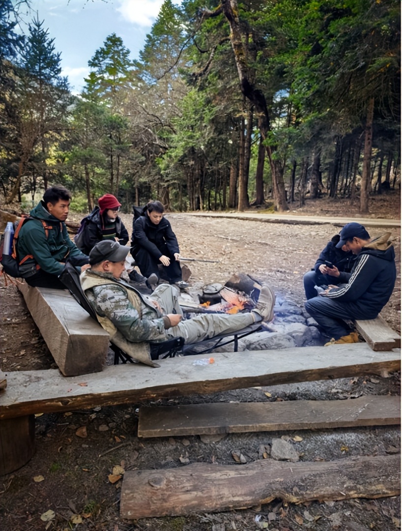 累了,撑着登山杖站立小憩;喘不过气来,背靠大树深呼吸,一鼓作气上到顶端的时候,一副难以想象的画面,直接让俺瞠目结舌,也把俺所有的疲惫和烦忧一扫而光。只见坡顶森林中,一块不大的平地上,竟升着一堆篝火,一位身穿迷彩上衣的中年驴友,正躺在一把折叠椅上,享受着炭火的温暖;巨大的木块,厚厚的炭灰,黝黑的铁壶,围坐在四周木板上的三五驴友,似乎在告诉你,来吧,歇歇脚,喝杯茶,烤烤火,暖暖身子,这里是雨崩!这里就是你的家!