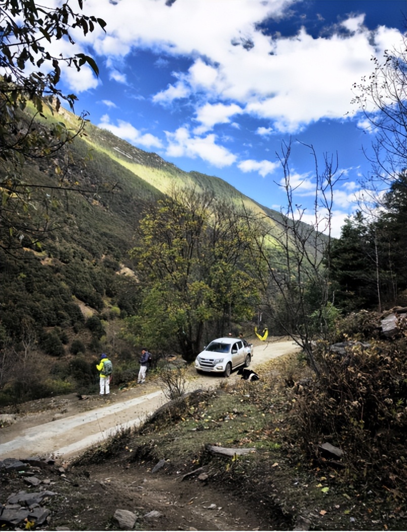 撑杖驻足,看此地人来人往,闹哄哄的样子,感觉也没有什么休息补给的必要,随继续大步前行。刚行不远,路突然平坦宽阔起来,行走其间一时十分惬意,小风一吹,刚刚攀爬湿透的内衣,也很快干爽。悠然自得之际,忽然身后传来“突突”的摩托声响,回头查看避让之时,一辆白色皮卡呼啸而过,浓浓的汽柴油味及卷起的尘土,呛的自己一时差点窒息。雨崩不是天堂,不是世外桃源吗?怎么还有如此这些玩意?那一刻,突然怀疑自己是不是走错了方向!