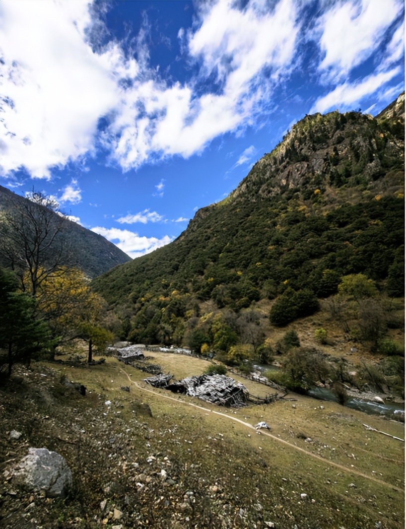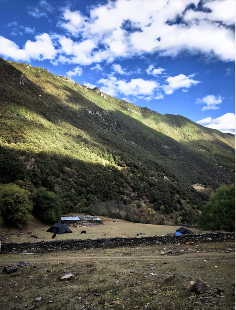 上行已经3小时40分,海拔2864米,拔高962米,距离已近10公里;谷底再次出现牦牛、牧场,石砌的围栏内,赫然有一顶黑色帐篷,抬头眺望,隐隐可见远处山坡上一排排的房舍,想来,雨崩马上就要到了!