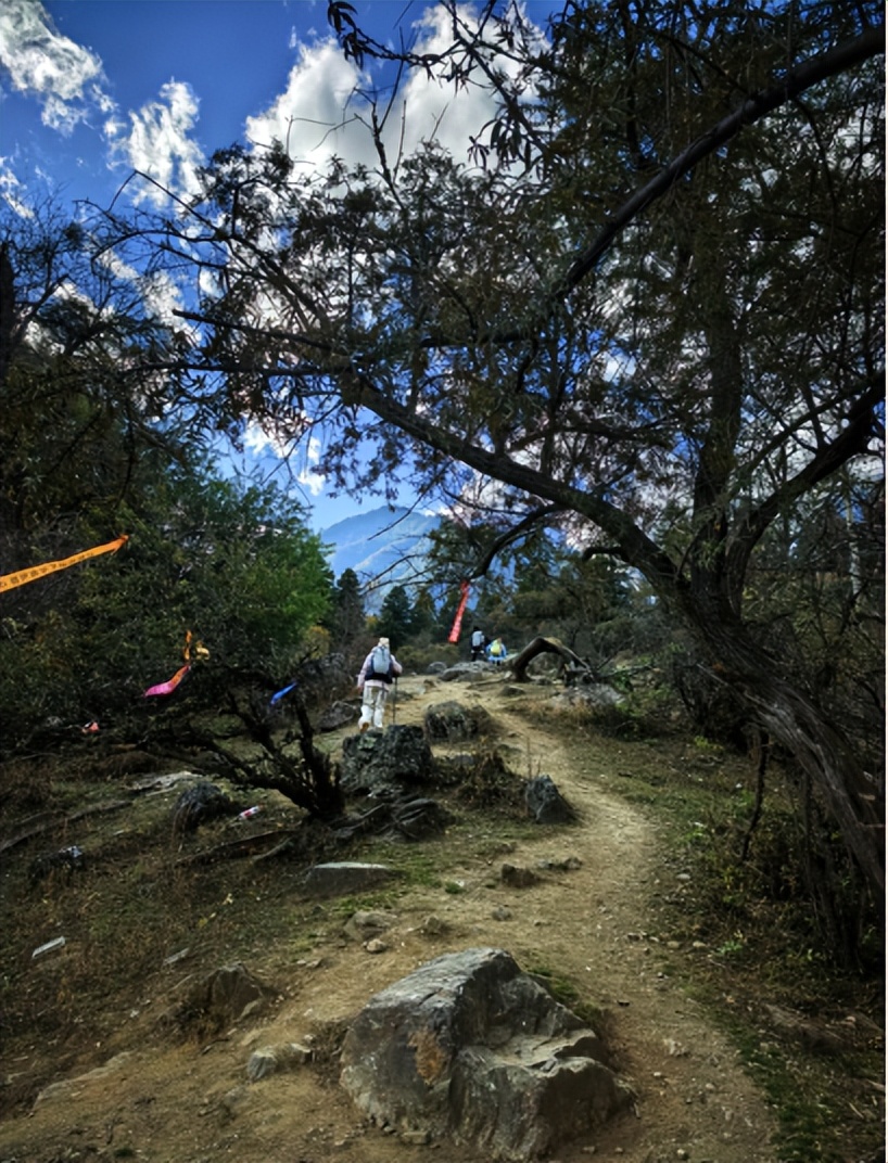 四五位年轻的驴友疾步走过,青春飞扬的气息扑面而来,让你忍不住起步追赶。上行的路曲折盘桓,一棵棵古树或立或卧,静静分布在路的周遭,原汁原味沧桑斑驳的样子,令人对雨崩的向往,禁不住又多了几分。