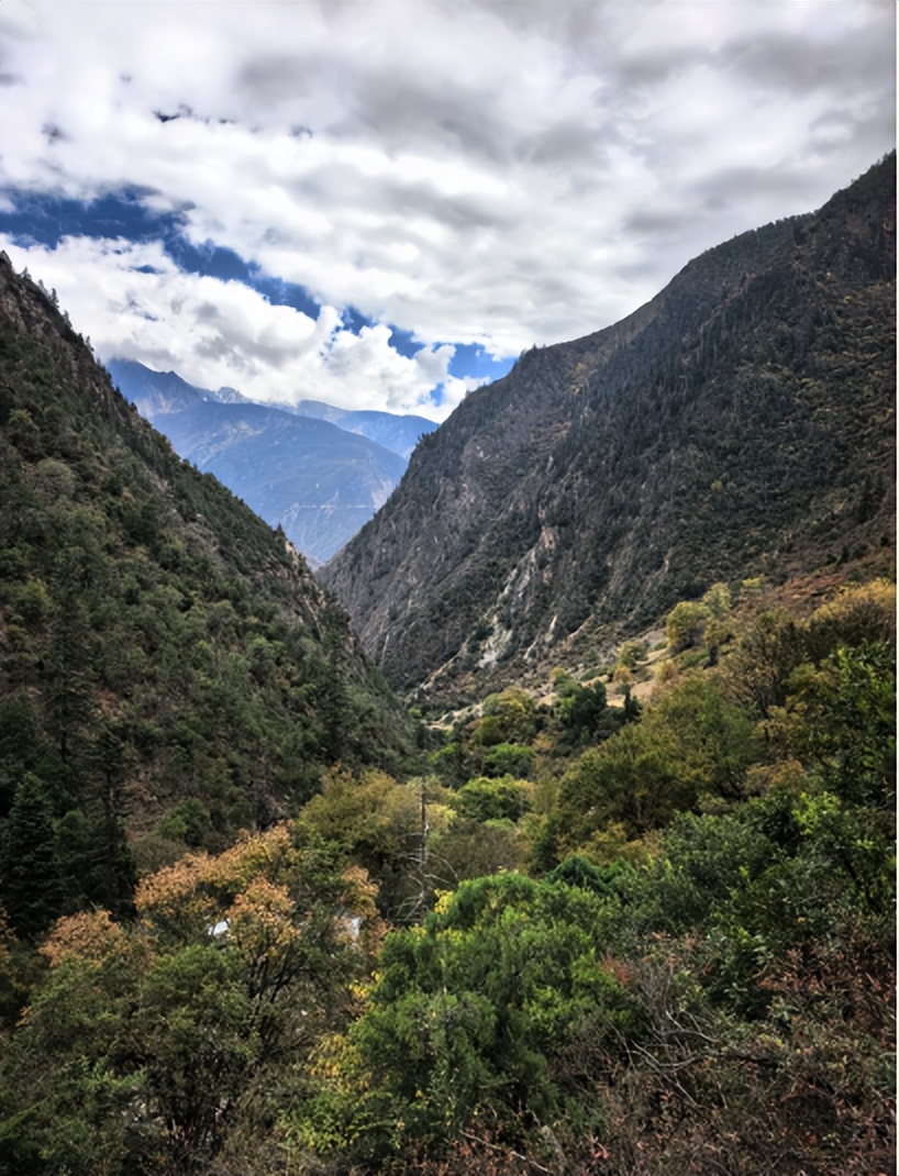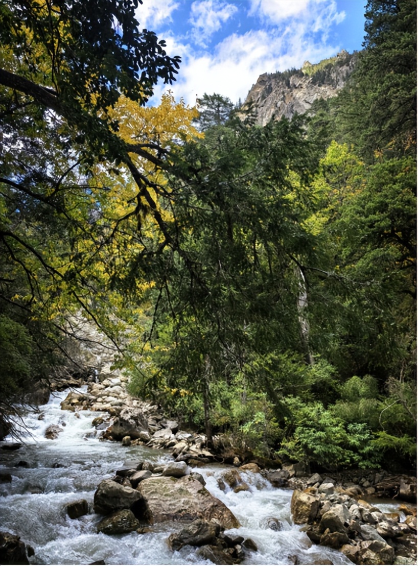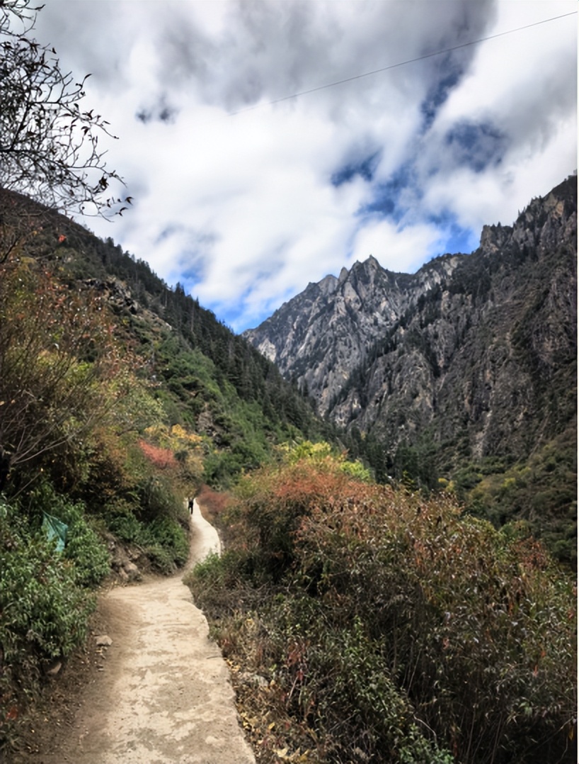 眼前是一段平坦的砂石路,踏入其中,恍若在泰山“快活三里”漫步。没有了安全之忧,忍不住静静观赏起了眼前的景致。只见四周山野五彩斑斓,就像一块巨大的俏色翡翠,那满眼温润的翠绿中,一抹绯红,一片金黄,任谁看了不怦然心动。回望一眼走过的峡谷,豪情满怀,眺望一眼前路的高山、密林,神秘悠长,令人想入非非。