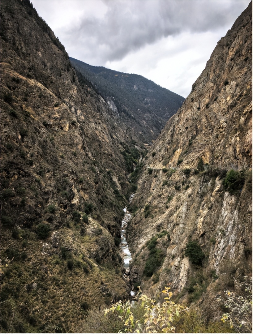 畅然前行,穿过长长的白马雪山隧道,车辆随山势不停地转弯、下行,海拔急速下降,11:18分,到达夹在山谷中,准备整体搬迁的德钦县城的时候,海拔已下降到2908米。路边停车小憩,随领队格桑兄弟,去其表妹店加完热水,转瞬即拐上狭窄的237省道。在植被稀疏,泥石流频发,弯道密集的山路上,继续向雨崩挺进。一面是幽深的峡谷,一面是摇摇欲坠的乱石,看一眼都心惊胆颤,格桑兄弟却一脸的风轻云淡,每一处转弯,每一个下坡,车开的都是那样丝滑、平稳。疑惑间正待相问,格桑兄弟幽幽吐露了自己,将十四年青春献给这条路的故事。说话间,11:50分,车过尼农澜沧江大桥,终于来到了海拔1962米的雨崩徒步起点——尼农大峡谷入口停车场。
