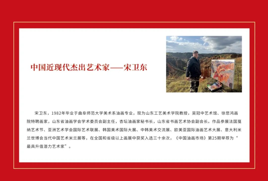 宋卫东,1982年毕业于曲阜师范大学美术系油画专业,现为山东工艺美术学院教授,吴冠中艺术馆、徐悲鸿画院特聘画家,山东省油画学会学术委员会副主任,杏坛油画家秘书长,山东省书画艺术协会副会长。作品参展法国戛纳艺术节、亚洲艺术学会国际艺术联展、韩国美术国际大展、中韩美术交流展、欧美亚国际油画艺术大展、意大利米兰世博会当代中国艺术米兰展等,在全国和省级以上画展中获奖入选三十余次,《中国油画市场》第25期举荐为“最具升值潜力艺术家”。