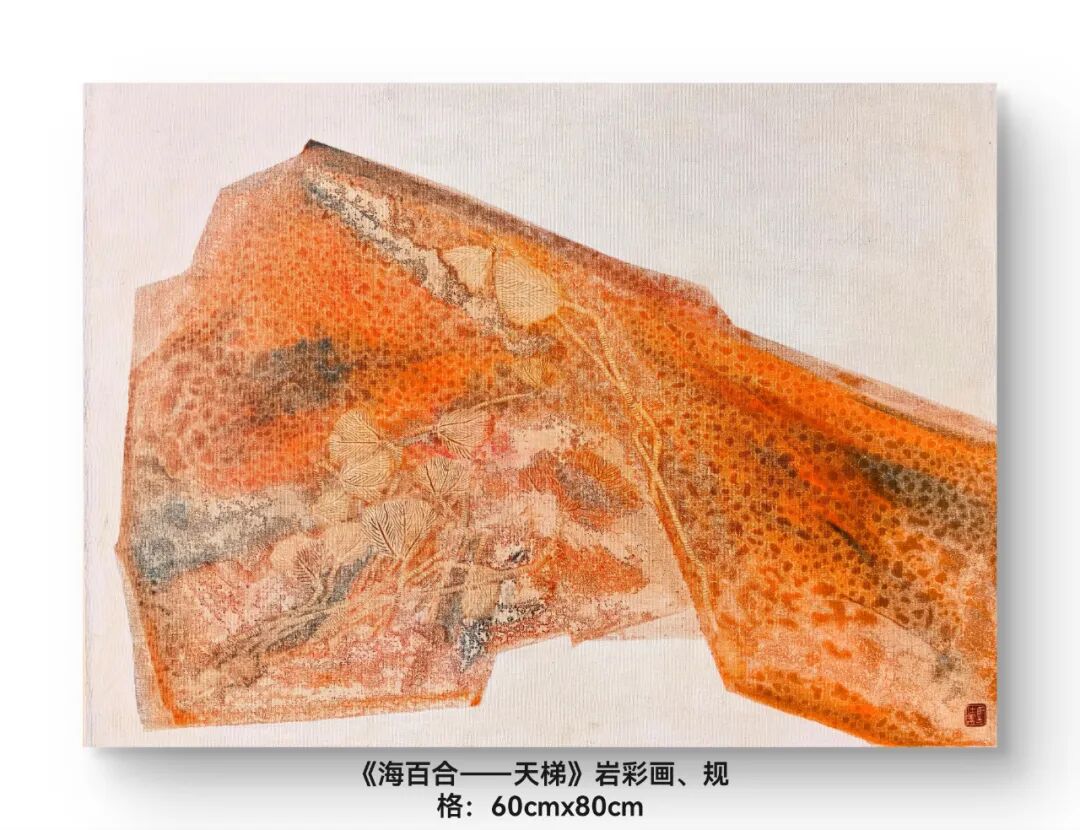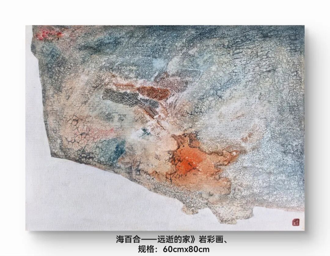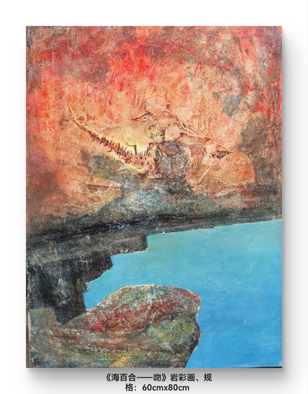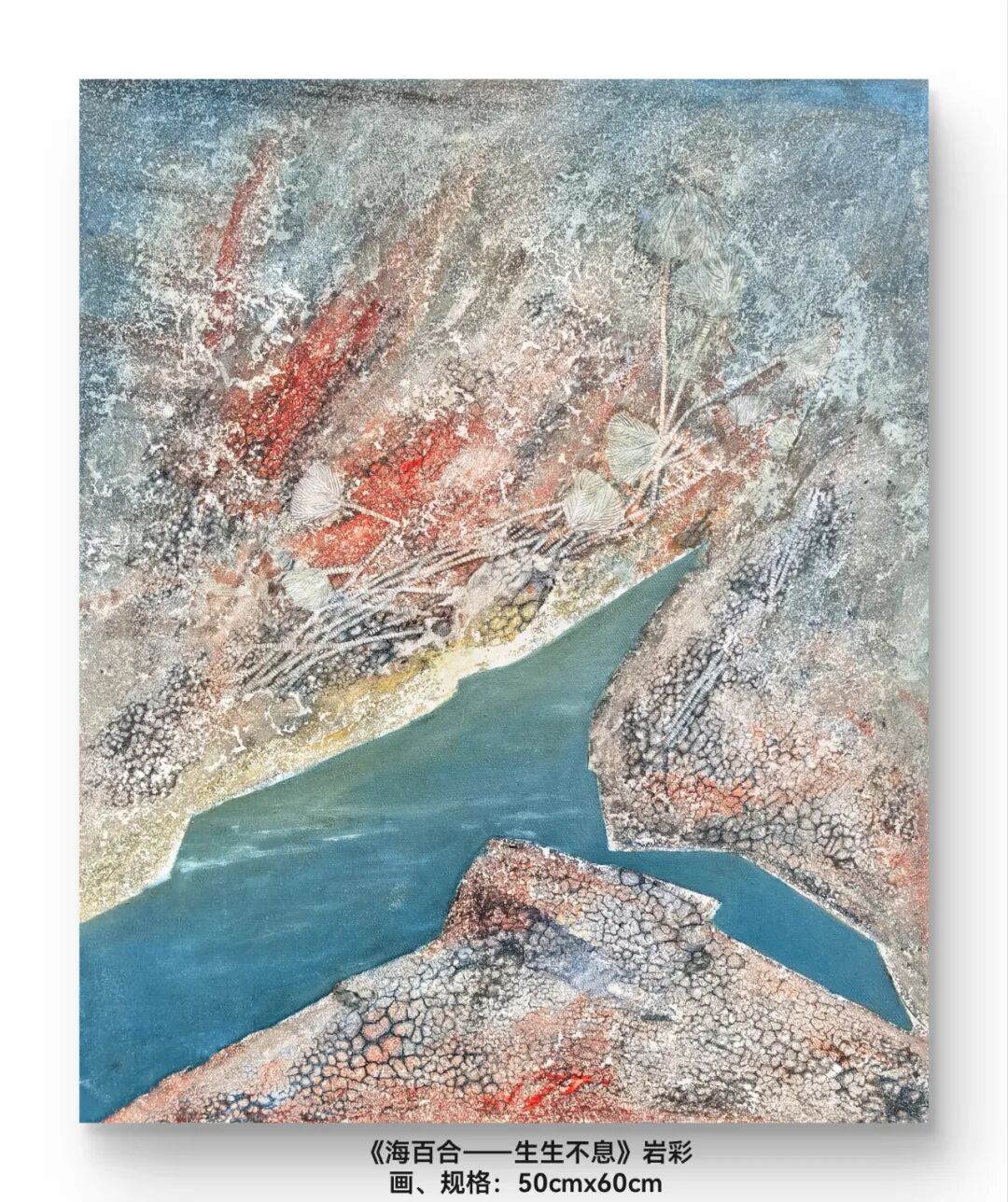 马仕祥教授最具开创性的贡献,在于他将深奥的学术发现转化为震撼人心的视觉语言。在《地球之痕——海百合》作品中,他运用岩彩材料的独特质感,再现了古生物在沧海桑田中的生命轨迹。每一笔矿物颜料的堆叠,既是艺术的表现,更是对地质年代的视觉诠释;每一处色彩的渐变,既符合审美规律,又暗合生物进化的逻辑。这种将学术深度与艺术高度完美统一的能力,使他的作品同时具备科学的严谨与诗意的灵动,开创了“学术艺术化”的全新创作模式。