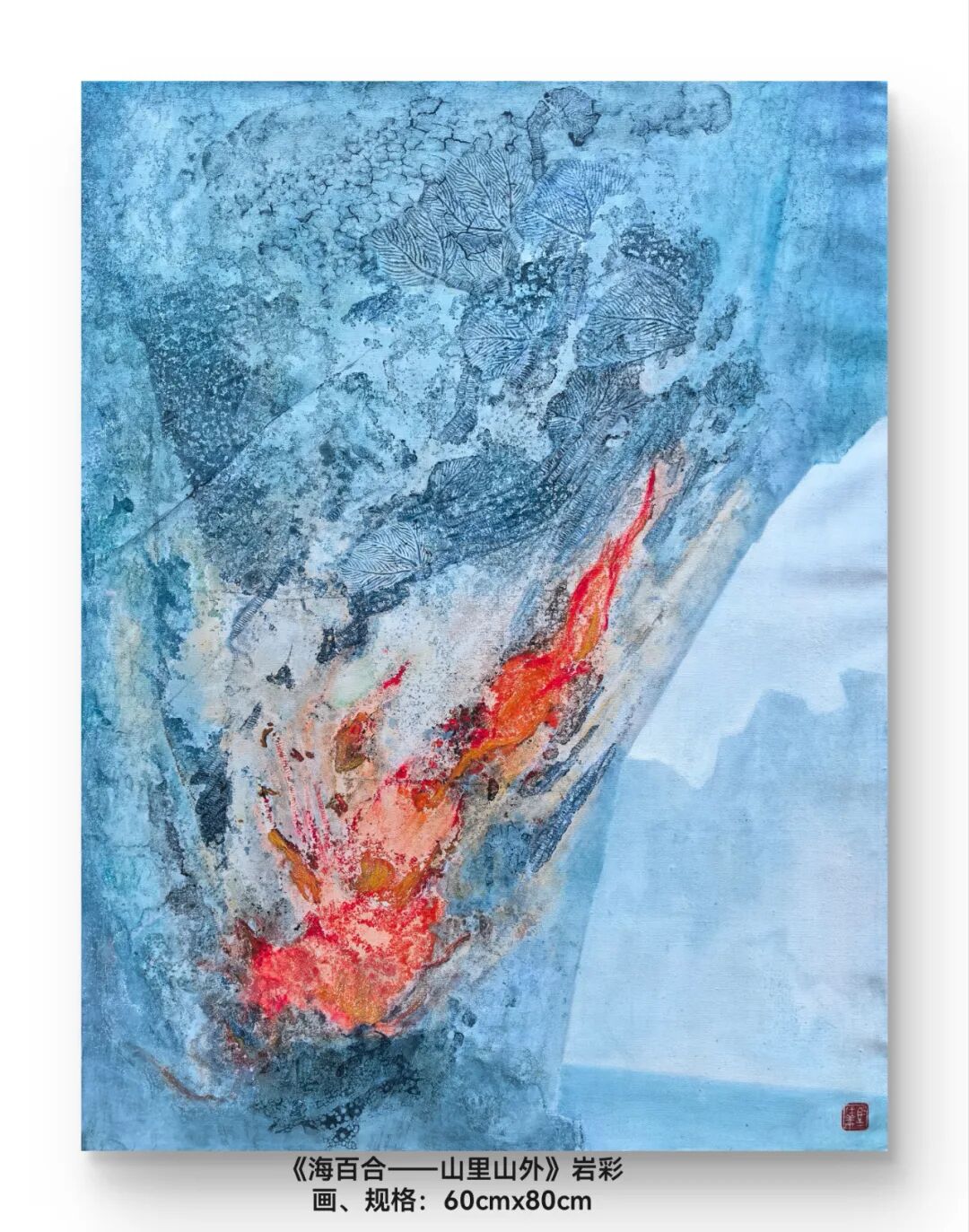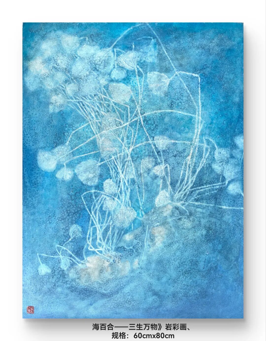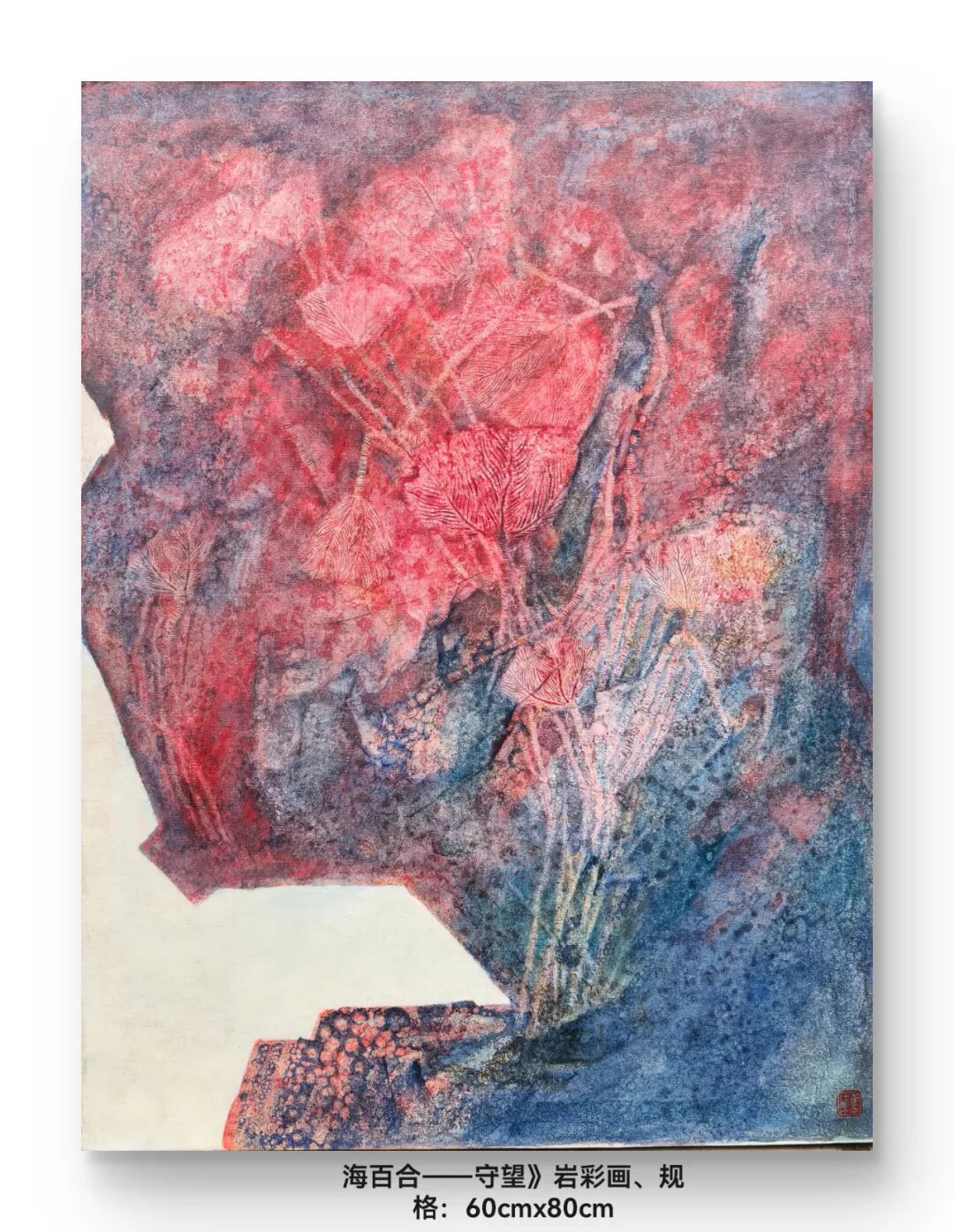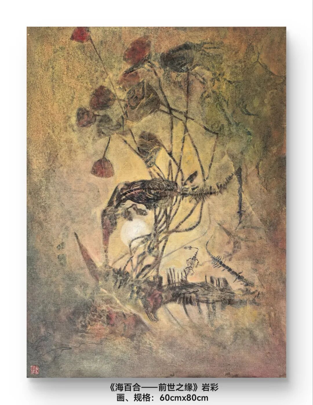 马仕祥教授最具开创性的贡献,在于他将深奥的学术发现转化为震撼人心的视觉语言。在《地球之痕——海百合》作品中,他运用岩彩材料的独特质感,再现了古生物在沧海桑田中的生命轨迹。每一笔矿物颜料的堆叠,既是艺术的表现,更是对地质年代的视觉诠释;每一处色彩的渐变,既符合审美规律,又暗合生物进化的逻辑。这种将学术深度与艺术高度完美统一的能力,使他的作品同时具备科学的严谨与诗意的灵动,开创了“学术艺术化”的全新创作模式。