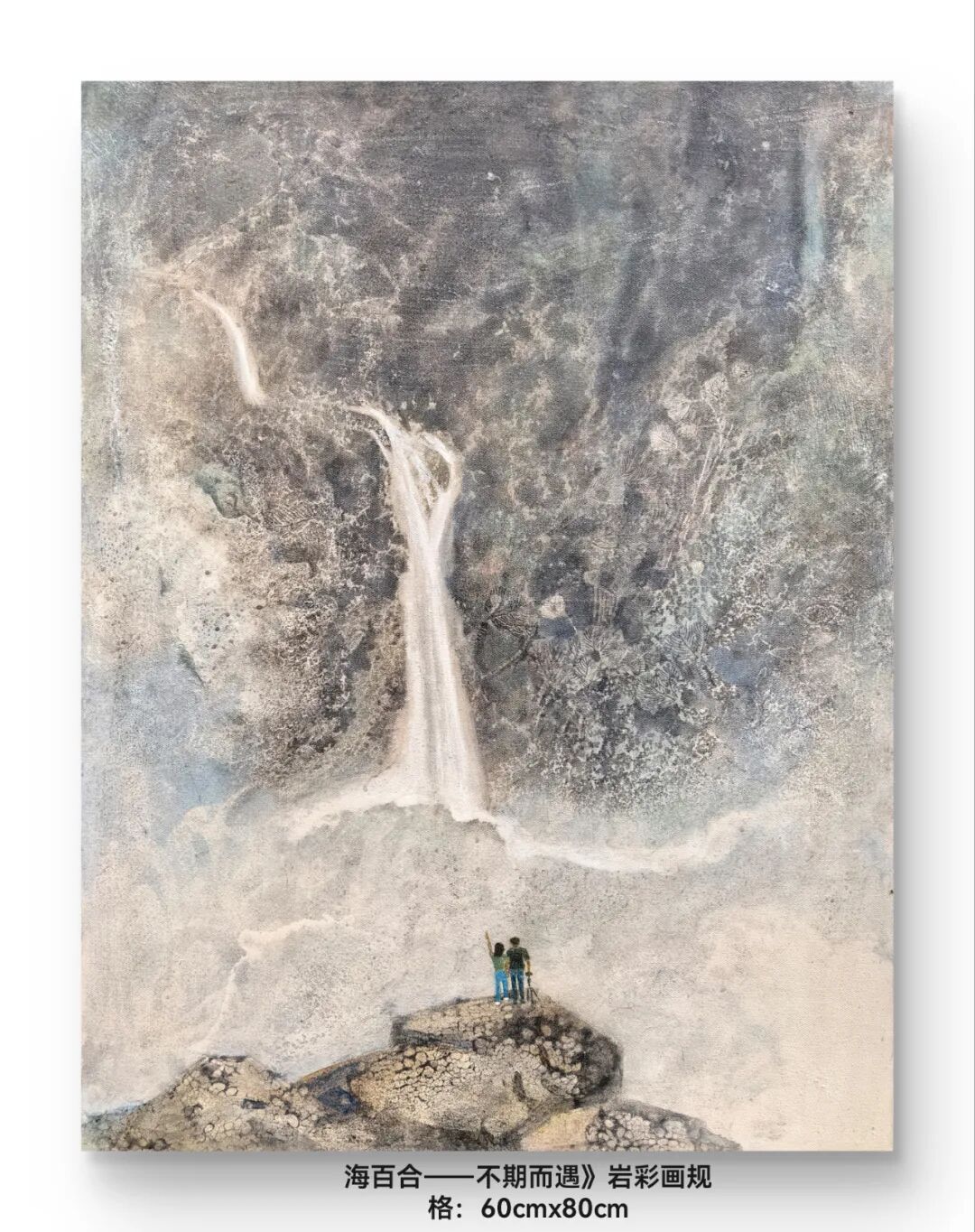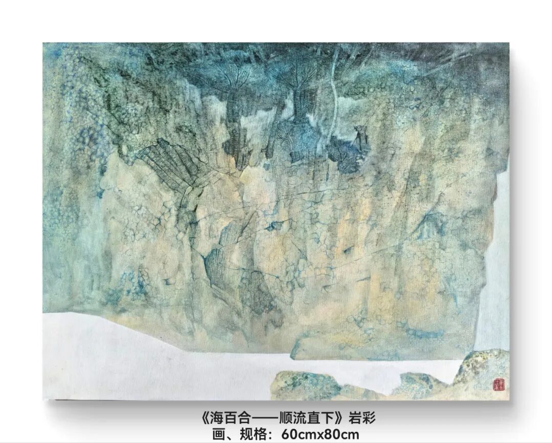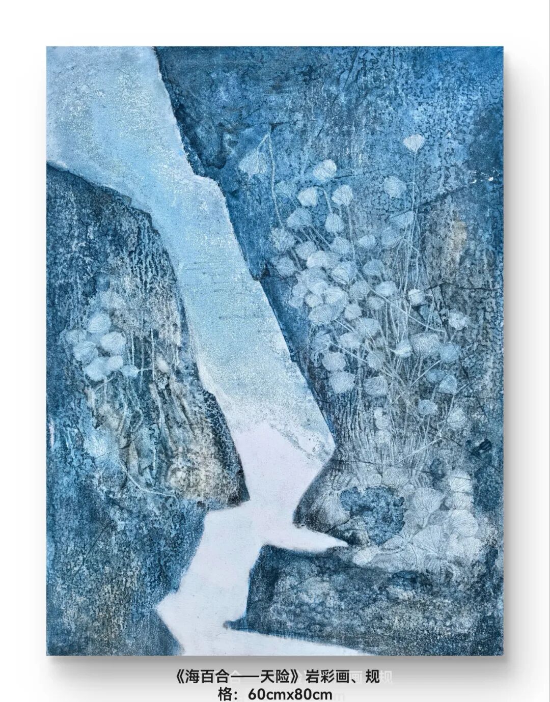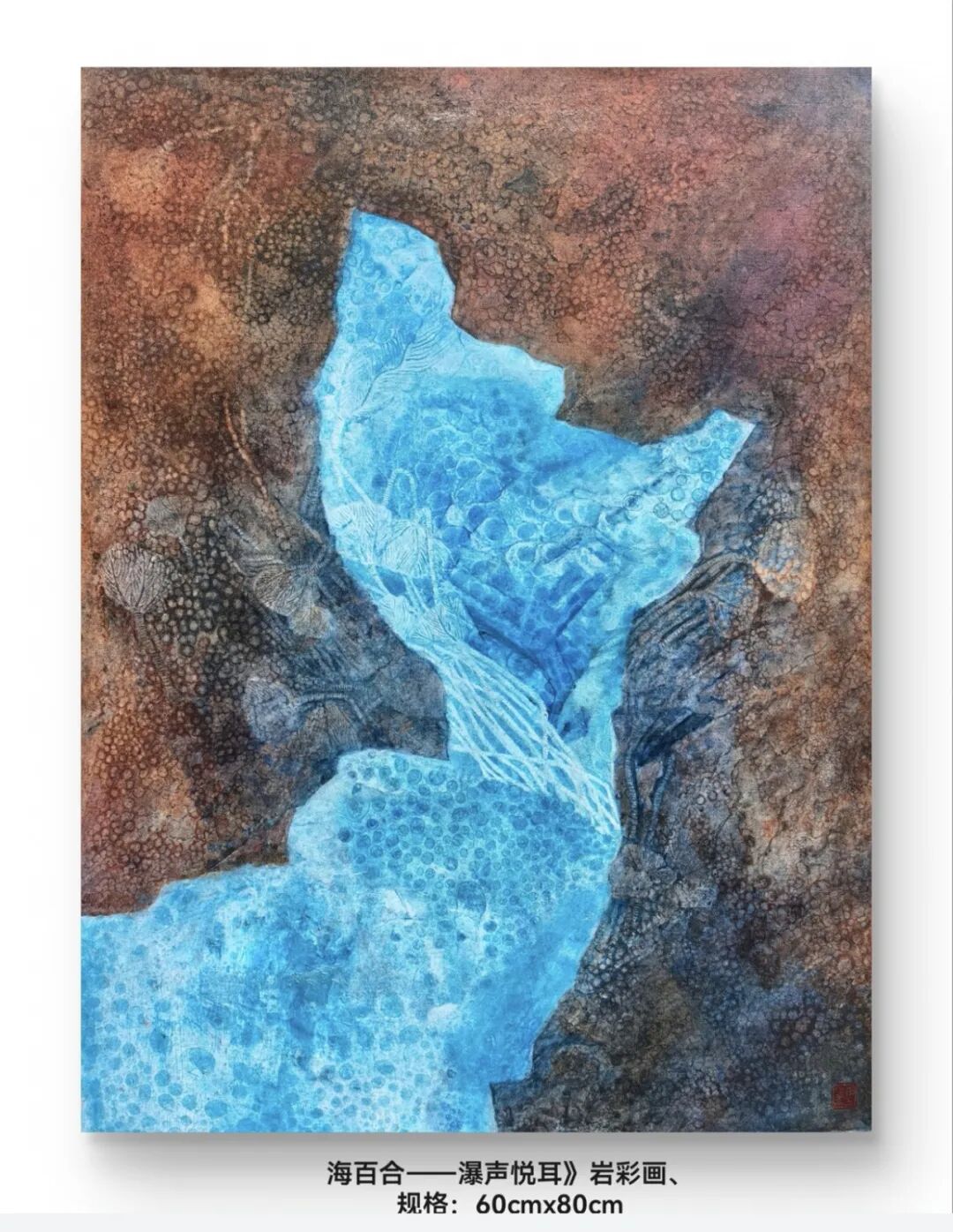 马仕祥教授最具开创性的贡献,在于他将深奥的学术发现转化为震撼人心的视觉语言。在《地球之痕——海百合》作品中,他运用岩彩材料的独特质感,再现了古生物在沧海桑田中的生命轨迹。每一笔矿物颜料的堆叠,既是艺术的表现,更是对地质年代的视觉诠释;每一处色彩的渐变,既符合审美规律,又暗合生物进化的逻辑。这种将学术深度与艺术高度完美统一的能力,使他的作品同时具备科学的严谨与诗意的灵动,开创了“学术艺术化”的全新创作模式。