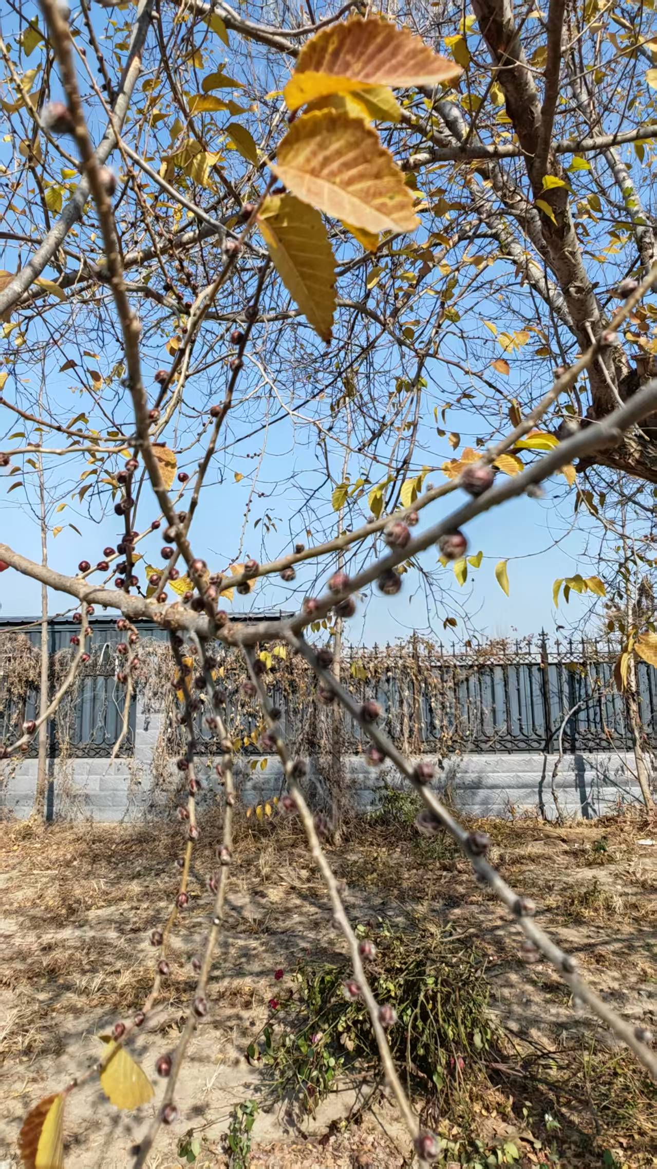 信步走到潍水大道,两旁的金叶榆已褪尽华服。碗口粗的嫁接树桩上,细枝如扫帚般支楞着,上面密密麻麻缀满紫黑色的芽苞。这些沉睡的生命看似寂寥,实则在寂静中蓄势待发。内子轻触枝头,若有所思:“你看这些芽苞,多像握紧的小拳头,在寒冬里做着春天的梦。”