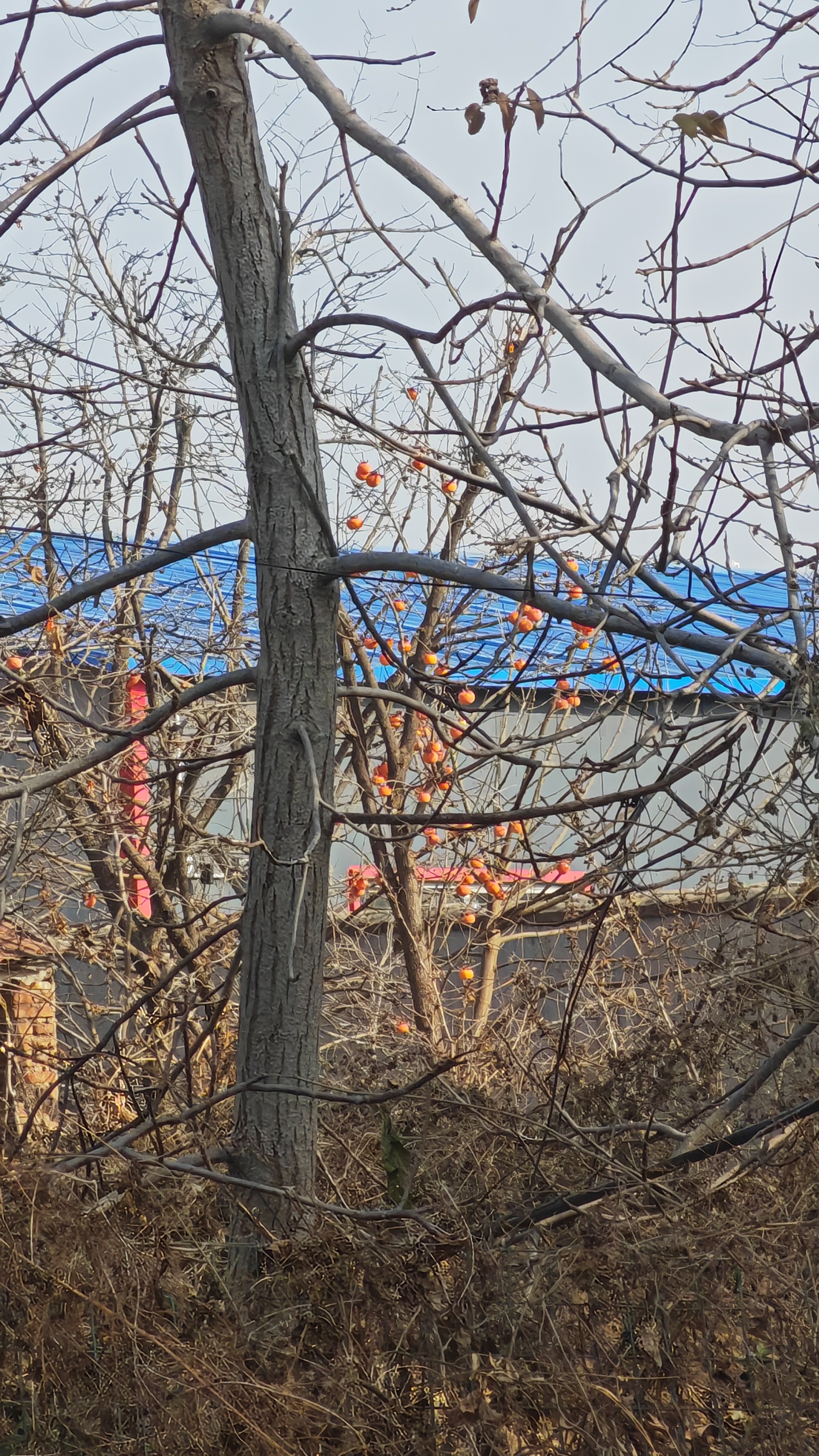 转过弯,一座废弃院落里的柿子树让人眼前一亮。叶子落尽的枝头,悬挂着数十个红灯笼般的果实。年年岁岁,这些无人采摘的柿子成了鸟儿的盛宴。几只麻雀在枝头跳跃啄食,欢快的鸣叫声与柿子的暖红,构成冬日里最动人的画面。更令人惊叹的是缠绕在高枝上的萝藦,干枯的蒴果裂开,释放出带着绒毛的种子,它们乘着微风飘向远方,完成生命的迁徙。