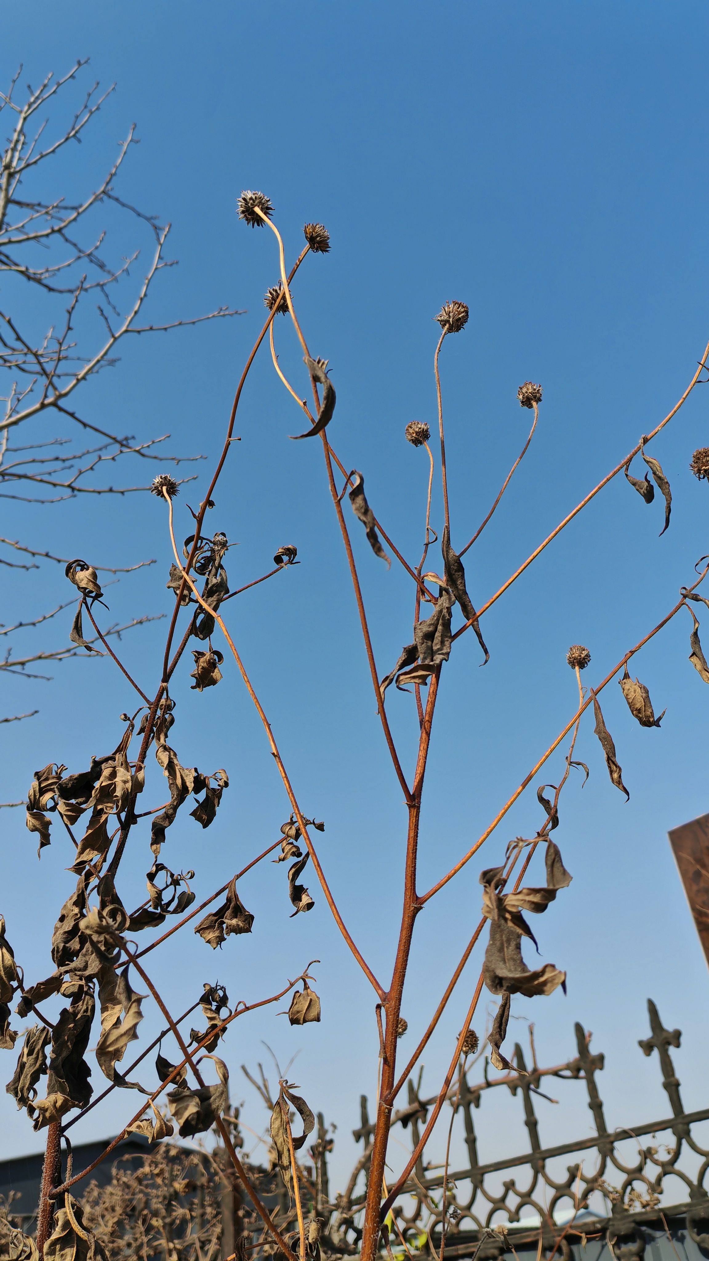 继续前行,在一处工厂围墙外,我们被一丛菊芋吸引。枯黄的秸秆在风中挺立,顶端残存的花序依然倔强地指向天空。拨开枯叶,地下必然藏着饱满的块茎——那些被称作“鬼子姜”的生命储藏室。这景象让我想起苏东坡“菊残犹有傲霜枝”的诗句,但眼前这丛菊芋展现的,不只是傲骨,更是一种生存的智慧:将最甜美的部分深埋土中,等待合适的时机破土重生。