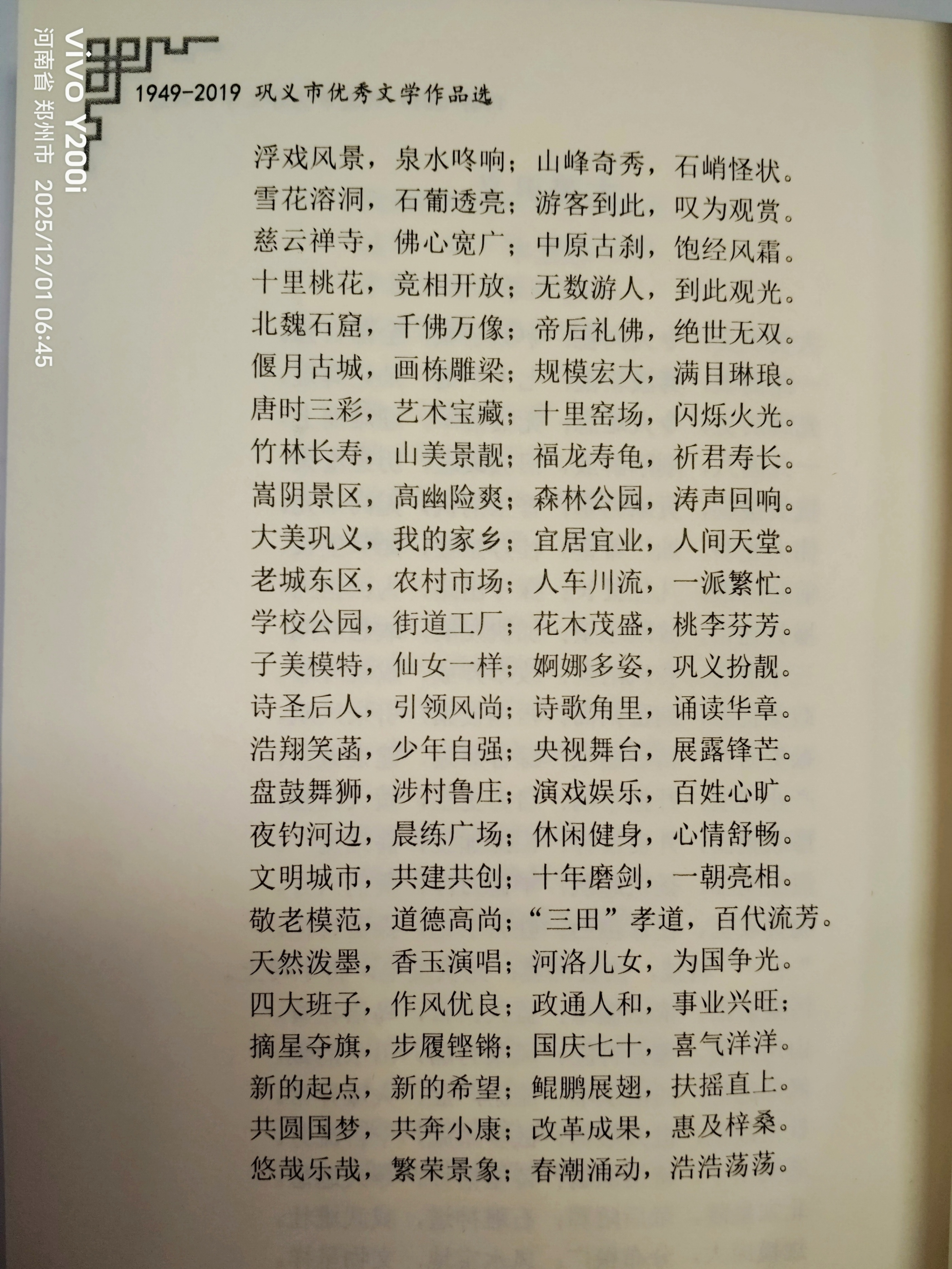 70年潮起潮涌,70年精品频出。近日阅读由侯发山主席主编,巩义市作家协会选编,南方文化出版有限公司出版的<1949——2019 巩义市优秀文学作品选>,入选的70年间巩义的68位老中青作者的每一篇小说、散文、诗歌、评论作品都令人赞叹,可圈可点。本人的四言长诗<大美巩义>能够有幸入选,现在想想我仍然心情激动,感慨万千: