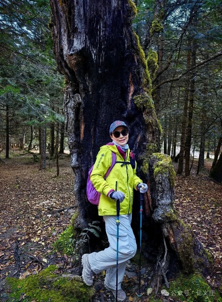 神奇的雨崩处处充满了神奇,进入密林不久,路边由三棵粗壮的沙棘、一棵挺拔的花楸、一棵年轻的红桦,组成的树木大家庭,就惊得俺目瞪口呆。五棵树木裸露的根部相互缠绕,你中有我,我中有你,“五树同根”,谁见了谁不惊叹。再行,路边一棵沧桑的古树令人肃然起敬,遐思无限。这棵古树,主干大部中空黝黑,那遭雷击起火燃烧的痕迹异常明显,但观之仍然郁郁葱葱,勃勃生机,就连那依附其生长的各类苔藓,也生机盎然。真不知这承受重创的古树,当年是如何疗伤自愈,挺过不堪的。千年的古树都是神灵,北靠大树留个影,沾沾古树的好运和灵气,愿余生在树神的护佑下,日有熹,月有光,富且昌,寿而康,长乐未央。