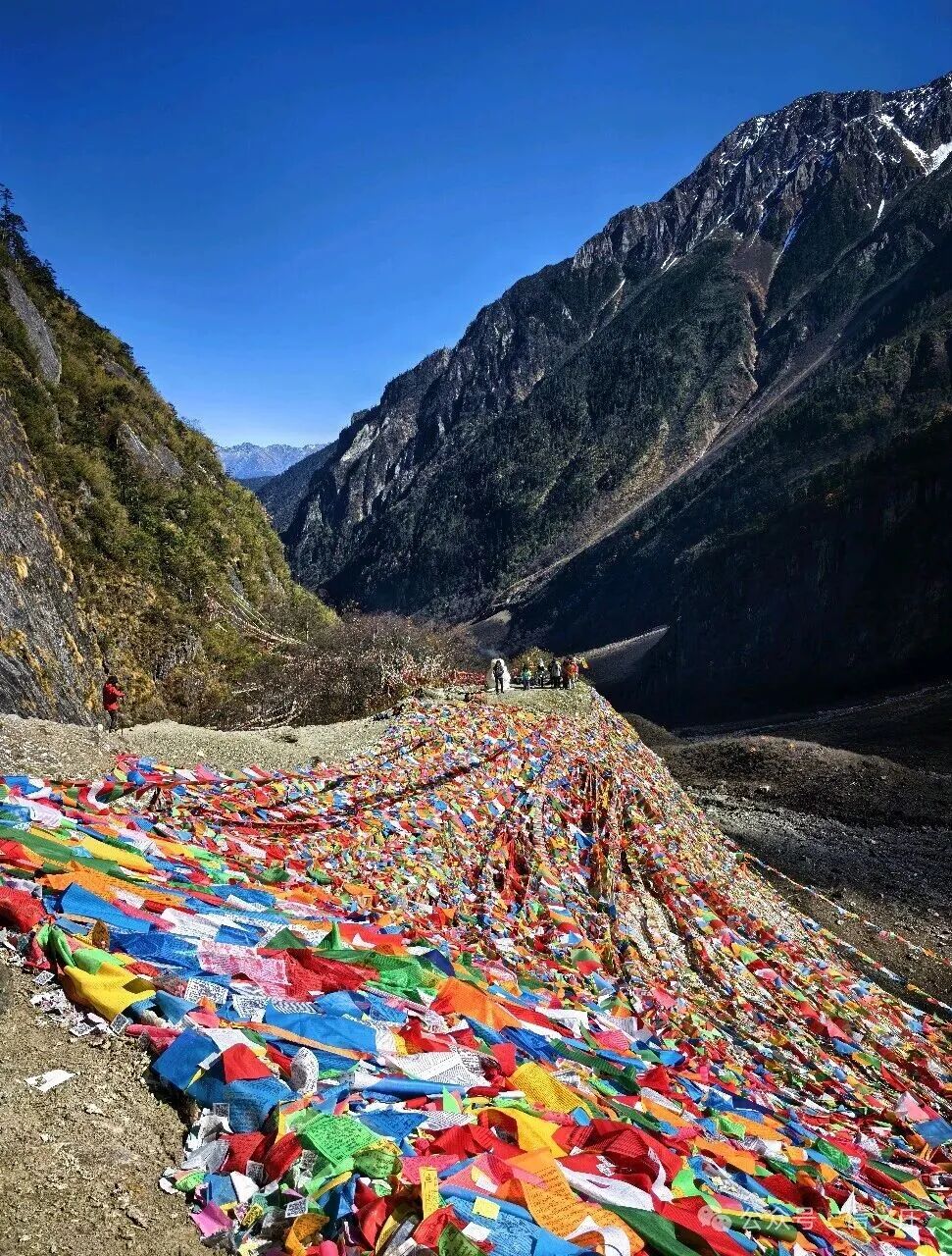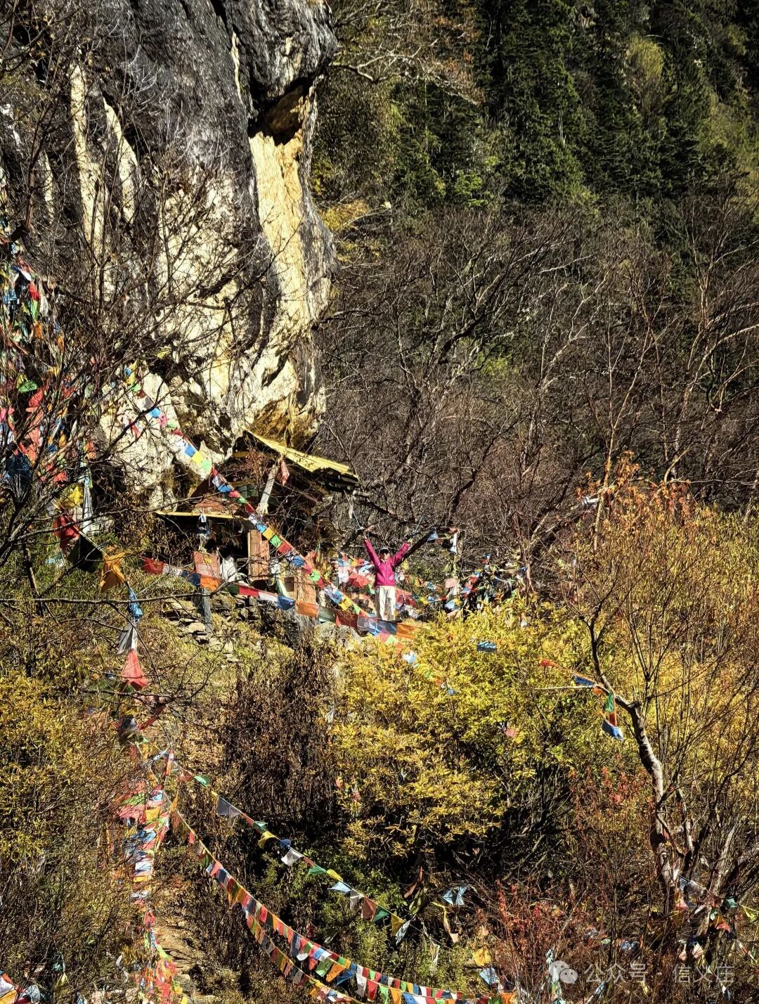 继续前行,路边仍是一棵接一棵的参天大树,落叶渐渐铺满了路的两侧,五彩经幡在路边,在头顶,也愈发多了起来,猎猎作响。行走路上,心中忽然莫名涌起一种从未有过的神圣感。这里的山林、河流、瀑布,似乎蕴藏着巨大的力量,能让每一个前来的驴友,不由自主地心生敬畏, 荡涤心霾,升华自我。