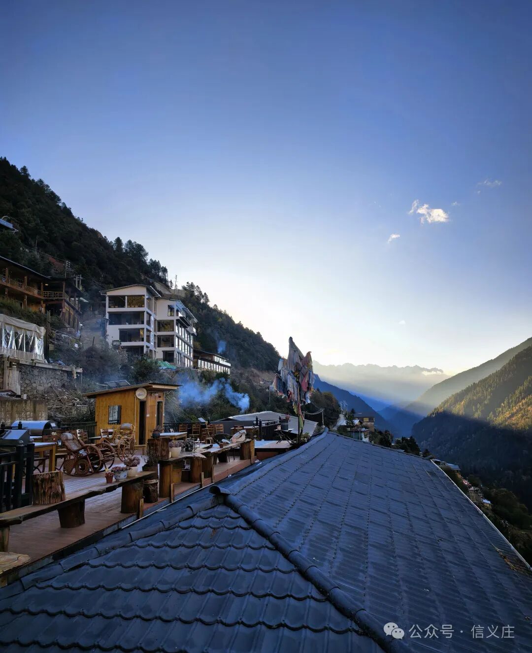 上天真是眷顾我们这些远方的游子,今天又是一个难得的晴天,晨起,沉浸在昨日兴奋中,还未回过神来的俺,早早又被金灿灿的阳光叫醒。一个人静静站立在客栈平台,看日出东方,看日照金山,看金光漫卷,看雪山、森林、村庄苏醒,看煨桑的青烟袅袅升起,看虔诚的信仰默默传递……一切都是那么的宁静、祥和、美好。