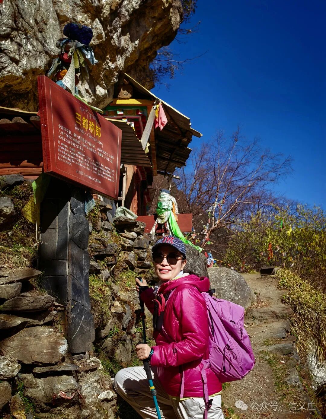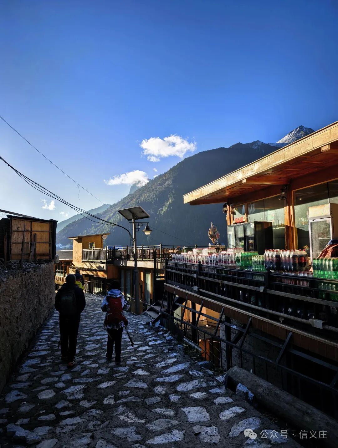 沿着小路悠悠下行,暖暖的晨光里温馨浪漫,走着走着,恍然如梦,这哪是高原徒步,分明是在故乡的旷野里漫游,又像是要去赶一场盛大的晚宴。七拐八拐,半小时左右,下到沟底,爬上一处长长的斜坡,擦过一棵一抱粗的古树,在写有“曲赤高顶”的指示牌前,缓缓踏入了海拔3054米的下雨崩村。