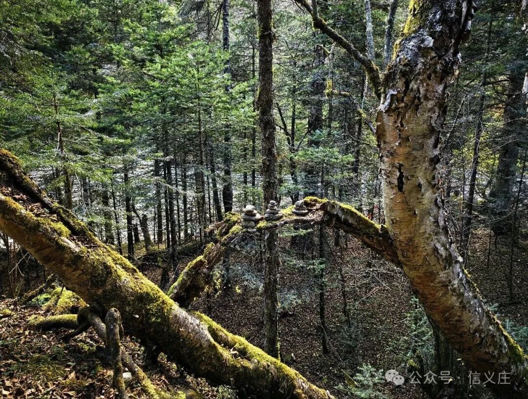 转经祈福的路上,总少不了经幡和玛尼堆,这去神瀑的路上,感觉尤甚,那玛尼堆几乎无处不在,触目皆是。路边一棵高大的红桦,其折断弯曲枯死的枝干上,竟也有信徒堆上了三个迷你玛尼堆,那超凡脱俗的样子,看了让人既惊喜又感动。转过一片密林,眼前忽现宽阔的雨崩河谷,此时,任谁都难以想象,这宽阔的河谷中,竟密密麻麻排满了高高低低、大大小小,无数的玛尼堆,观之实在令人震撼!什么是信仰,这就是信仰!